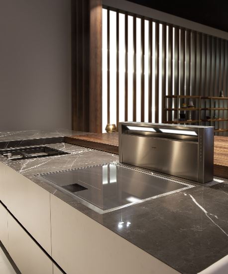 L’isola contempla un piano cottura a induzione completa Gaggenau serie 400 con telaio in acciaio inossidabile, TFT touch display per un controllo intuitivo di tutte le funzioni e sensore di cottura per il controllo della temperatura in vaso. La cappa telescopica da tavolo è anch’essa Gaggenau serie 400 ed è completamente retrattile quando non utilizzata. Realizzata interamente in acciaio inossidabile con uno spessore di 3 mm.