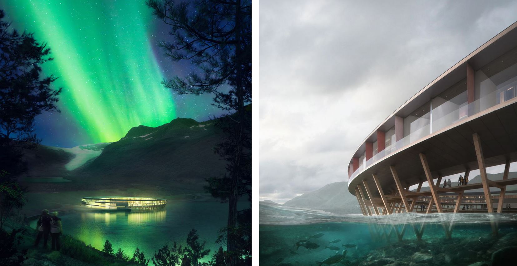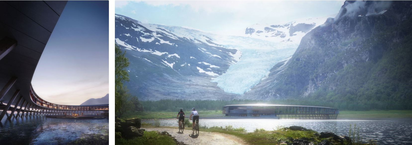 LA FORMA – L’hotel è circolare e si sviluppa dai pieni del monte Almlifjellet nel fiordo di Holandsfjorden. La sua forma è necessaria per assicurare una vista panoramica del fiordo e dar l’idea di prossimità con la natura. TUtto il tetto è costellato di pannelli solari e la posizione è stata attentamente studiata osservando il sole e il movimento che fa sulle montagne circostanti. L’edificio è ispirato dall’architettura locale che è piena di “fiskehjell” che sono strutture lignee dove si secco il pesce, assieme al concetto di “rorbue”, una casa stagionale tipica dei pescatori norvegesi che appoggiano le radici sull’acqua.
