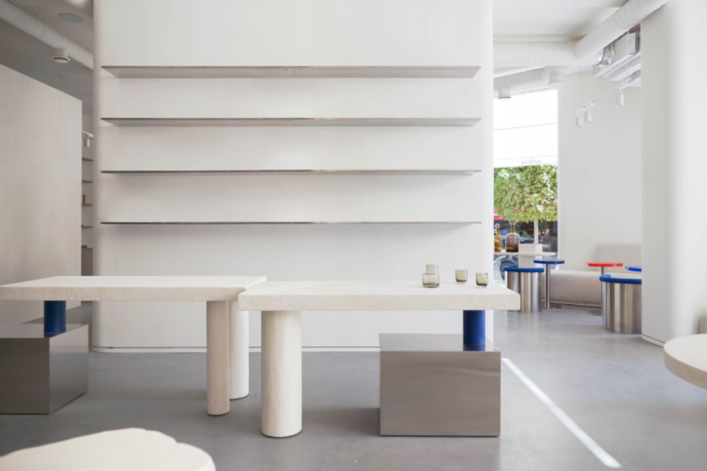Il concept degli interni pone l’accento sul contrasto attraverso texture e materiali, bilanciando pavimenti in cemento grezzo con pareti in gesso liscio e colori vivaci di accento blu e rosso. Sopra la reception, una grande striscia di metallo si attorciglia dal soffitto al pavimento, sostenendo le pareti circolari e gli scaffali. Al centro della sala, tavoli di varie altezze e forme forniscono esposizioni flessibili per esporre i prodotti.