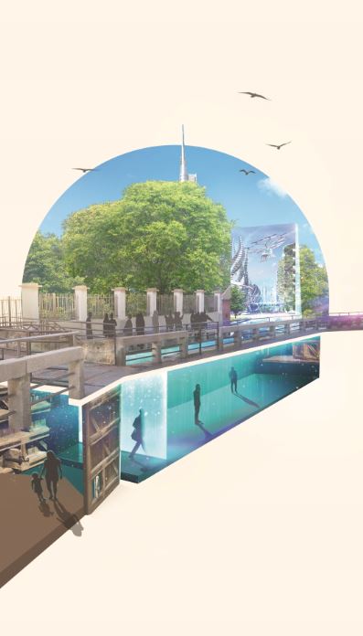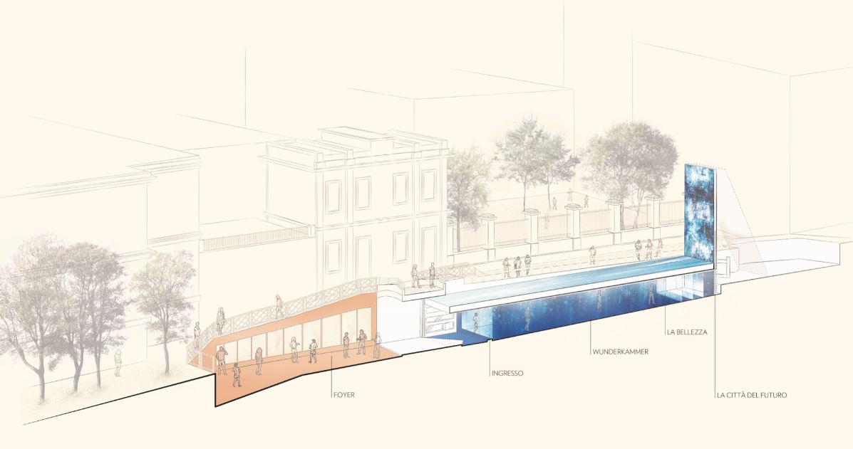 Qui, a copertura della Conca, verrà creato un vero e proprio innesto architettonico sottoforma di grande specchio d’acqua, al cui estremo un grande schermo a LED diventerà una finestra sulla Milano del futuro mostrandoci uno skyline mutevole a seconda del momento della giornata. Al di sotto di questa struttura, proprio all’interno del canale, verrà creata una Wunderkammer in cui i visitatori potranno esperire tutta la bellezza, l’energia e la forma dell’acqua in un ambiente totale che li avvolgerà nell’immagine e nel suono grazie all’uso delle tecnologie più avanzate.