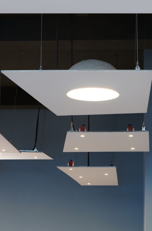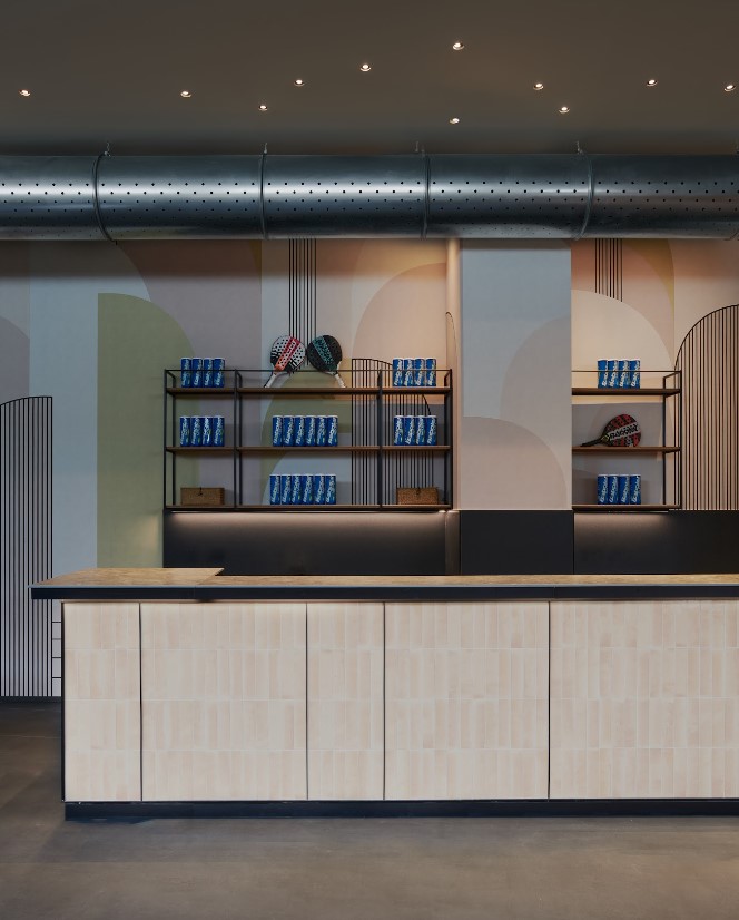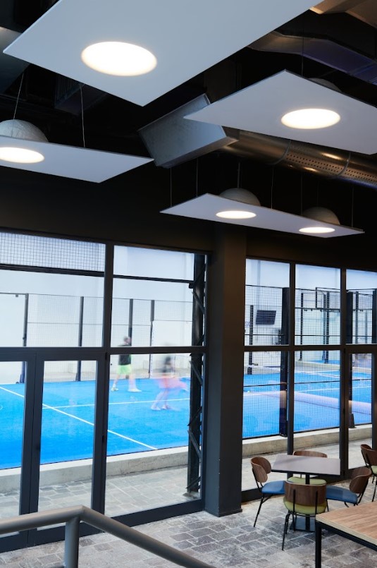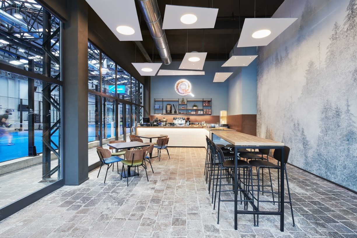 Il piano terra affaccia direttamente sui campi da padel creando continuitร tra sport e cucina. Qui i prodotti a incasso Polaris valorizzano il soffitto industriale a vista con lโintegrazione di pannelli sospesi che danno vita a cupole luminose, creando un effetto di continuitร visiva e luce indiretta. Sopra il bancone, Genius Curve riprende le forme stondate di Polaris, garantendo un’illuminazione discreta ma dalle prestazioni elevate. Il legame tra il mondo sportivo e culinario รจ presente su entrambi i livelli attraverso diversi elementi che fanno riferimento allo sport principe della struttura.