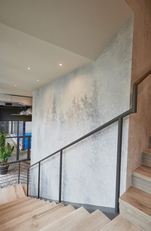 Elementi industriali si alternano a colori naturali come il legno presente in diversi elementi dโarredo e il verde che ritroviamo nelle piante e su alcune pareti.
