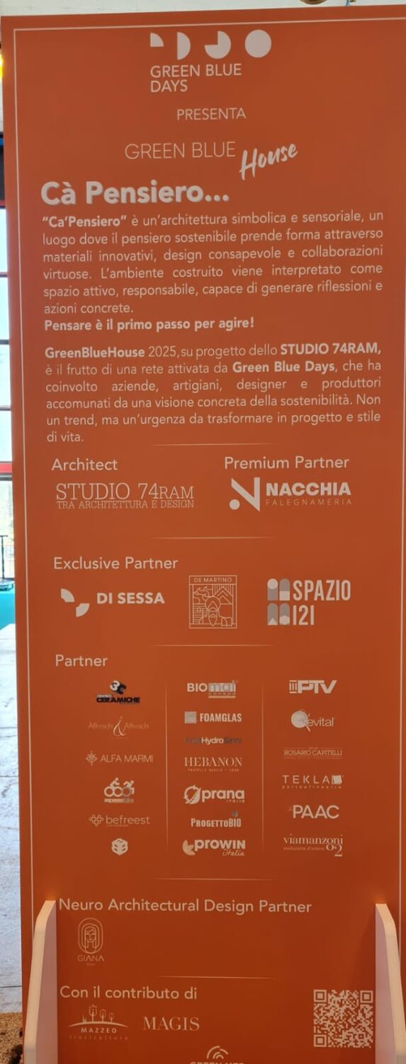 Con l’installazione della GreenBlueHouse, dal titolo “Ca’ Pensiero” guardiamo alla casa come un luogo materiale e immateriale. La casa come luogo dove il pensiero orientato alla sostenibilità prende forma e si traduce in azioni concrete. Pensare è il primo passo per agire e Ca’ Pensiero rappresenta il punto di partenza per una riflessione che si traduce in pratica quotidiana, dove la sostenibilità è un percorso tangibile dove ogni piccolo cambiamento, ogni attenzione quotidiana, diventa una scelta che ha il potere di influenzare profondamente il nostro modo di pensare e dunque di abitare il mondo. La rappresentazione dello spazio costruito con materiali e processi circolari vuole suscitare riflessioni nei visitatori. Un’esperienza educativa tesa a rappresentare modelli ed azioni di un abitare sostenibile. Ogni dettaglio, dagli arredi agli abiti, dall’aria all’acqua purificata, è una testimonianza di processi virtuosi e scelte etiche. La struttura stessa, con il suo design essenziale e innovativo, pone al centro il valore della sostenibilità, trasformando i materiali di uso comune in elementi narrativi.