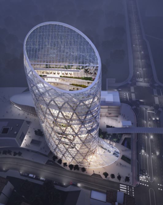 Su un’area di 37.500 mq per un’altezza di 53 metri, l’edificio si compone di un corpo principale di100 metri di lunghezza con 12 piani fuori terra, 3 nel corpo basso e 3 sotto terra.