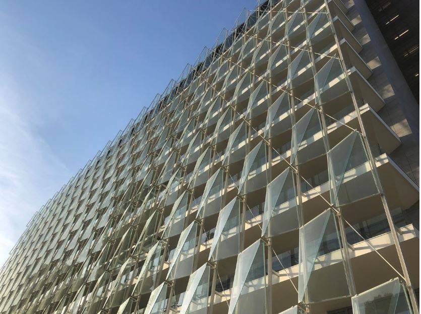 Una facciata prismatica ed elegante, in armonia con il contesto, caratterizza l’edificio De Castillia 23 grazie ad un gioco di diagonali che disegnano una scacchiera di vetro, dove pieni e vuoti si avvicendano in un movimento dinamico di sfaccettature e trasparenze. a soluzione progettuale proposta dal team di Progetto CMR, scelto dal Gruppo Unipol per la riqualificazione dell’edificio di via De Castillia non cura solo gli aspetti estetici, ma ha l’obiettivo di migliorarne la funzionalità, le prestazioni energetiche e l’efficienza complessiva legata alla gestione dell’immobile. Ne scaturisce un edificio iconico dotato di soluzioni tecnologiche all’avanguardia, costituito da due corpi fabbrica di 53 e 15 metri di altezza che formano un angolo di 45°.