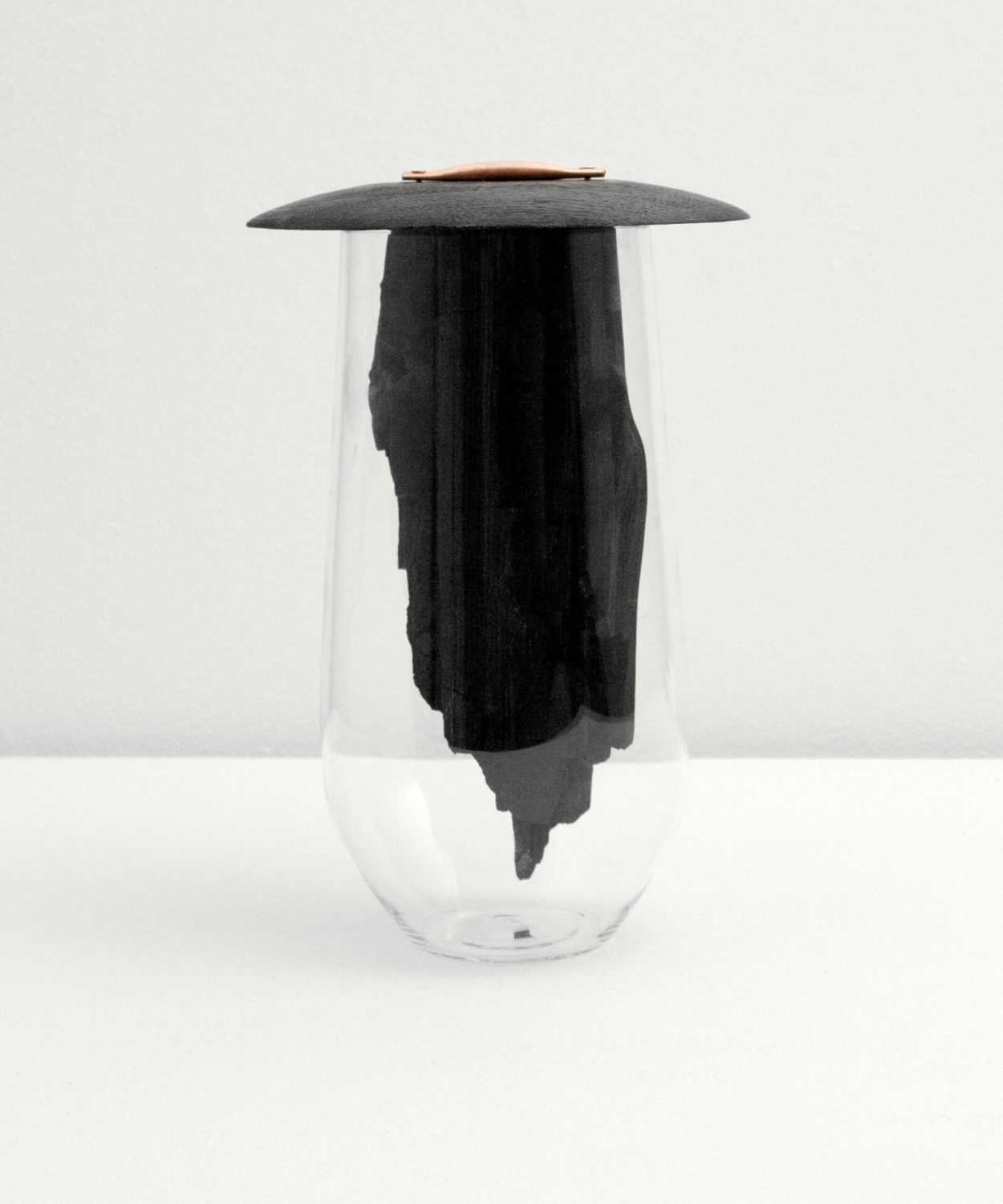 legno di quercia carbonizzato, vetro soffiato, rame, altezza 30 cm