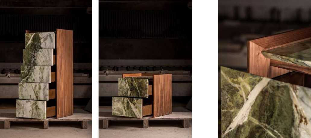 (Niccolò Garbati). La forma del comodino (anche in foto di apertura servizio) evoca un monolite contemporaneo, un blocco unico in cui la continuità visiva è garantita dalla precisa integrazione dei cassetti rivestiti in marmo Musk Green che, oltre a