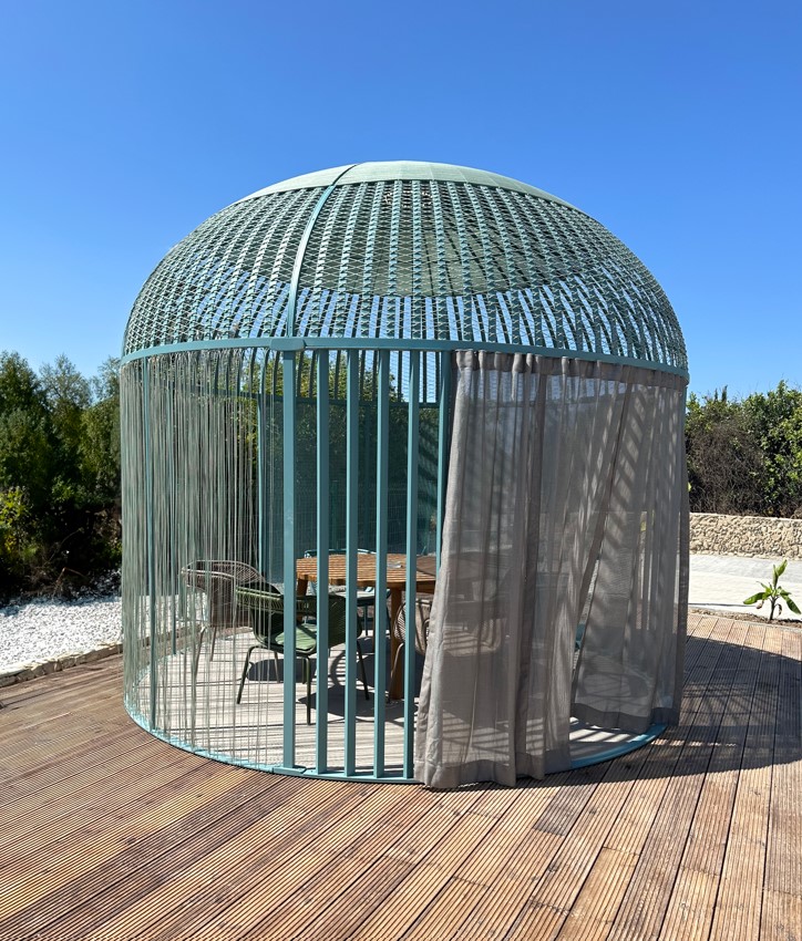 Il giardino di quasi 300 mq, piantumato e curato dal punto di vista del prato, che si snoda intono alla villa diventa luogo di narrazione delle collezioni YAAZ, fra cui TURTLE che si compone di diverse sedute e comprende anche una sedia a dondolo dalla particolare forma avvolgente, e il gazebo FESS allestito su una grande pedana in teak: con la sua struttura a cupola in alluminio, rifinita con una lavorazione in corda e tendaggi, il progetto rappresenta un nuovo concept abitativo in cui rifugiarsi nelle ore più calde della giornata.