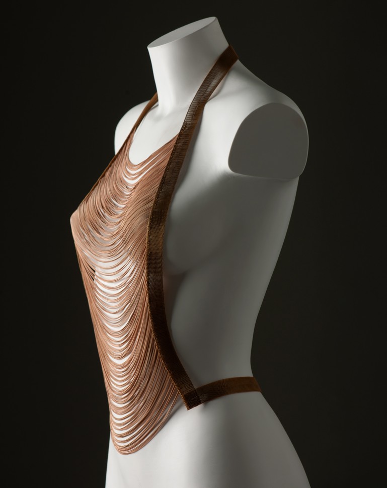 Il Corpetto Amina è una scultura da indossare, composto da mille fili intrecciati su un tape di ottone che si stringe attorno alla vita, sale lungo le costole e scompare dietro il collo, creando la sensazione di un abbraccio costante. La Farfalla Body Necklace è un filo sottilissimo che si lega dietro al collo per poi scendere e incrociarsi sul cuore, entrando ed uscendo da un pendente intarsiato al centro del petto, simbolo della connessione eterna. La collezione include anche gli anelli e gli earcuff Talia, gioielli pensati come amuleti protettivi, e la collana Iride, che come un raggio di sole avvolge la gola con un’aura di luce. Gli anelli Uranio, in bronzo con finitura opaca in palladio, racchiudono pietre tagliate a mano che custodiscono segreti nascosti: un’agata con geode cela al suo interno un’altra gemma, cristalli di ametista esplodono come un vulcano, mentre le piriti creano una texture lunare unica.