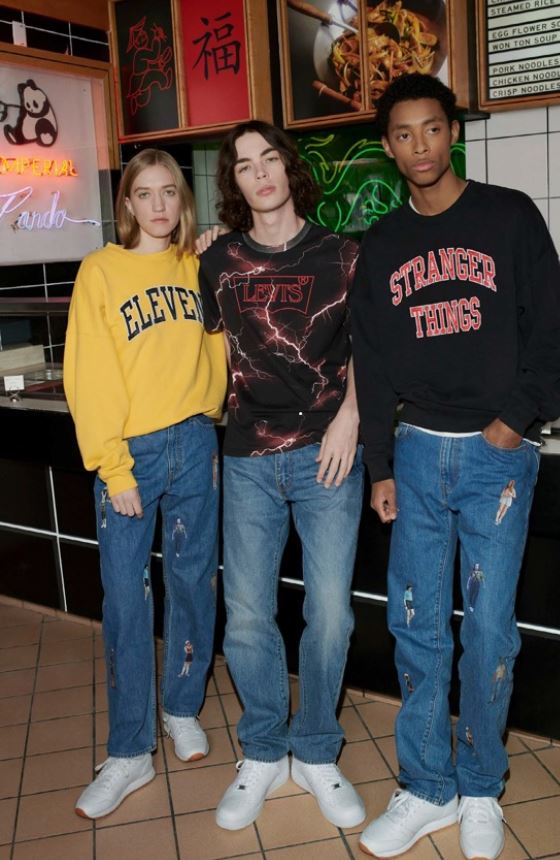 Attualmente Levi’s è nei negozi con la capsule collection in collaborazione con la serie di successo di Netflix, “Stranger Things”. Lavorando direttamente con i costumisti di Stranger Things durante la terza stagione, il produttore di jeans ha sfruttato i suoi vasti archivi affinché i costumi dei personaggi fossero in sintonia con lo stile del periodo. Ci sono due looks presenti nella serie: la camicia Aztec Print e i El Pleated Jeans indossati da Undici più il cappello Trucker e la T-Shirt Camp Know Where Ringer indossati da Dustin. A questi si aggiunge una serie di pezzi che celebrano vari elementi della serie. T-shirt e felpe con la grafica e le frasi di Stranger Things, jeans e cappelli con immagini dei personaggi, articoli speciali in limited edition, come toppe rovesciate e linguette rosse (un cenno al «sottosopra», ovviamente), e una Batwingtee unica nel suo genere che utilizza la grafica del titolo di Stranger Things.