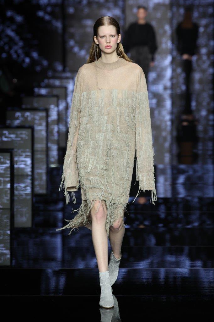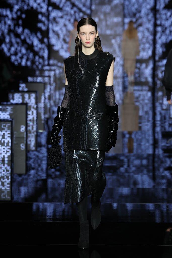 L’uso sapiente di finiture liquide lucide, pellicole metalliche e paillettes quadrate irregolari conferisce un glamour deciso alla collezione. I colori vivaci, nel frattempo, influenzati dall’intelligenza artificiale, si fondono con tonalità più morbide e ultraterrene, creando un’esperienza sensoriale unica.