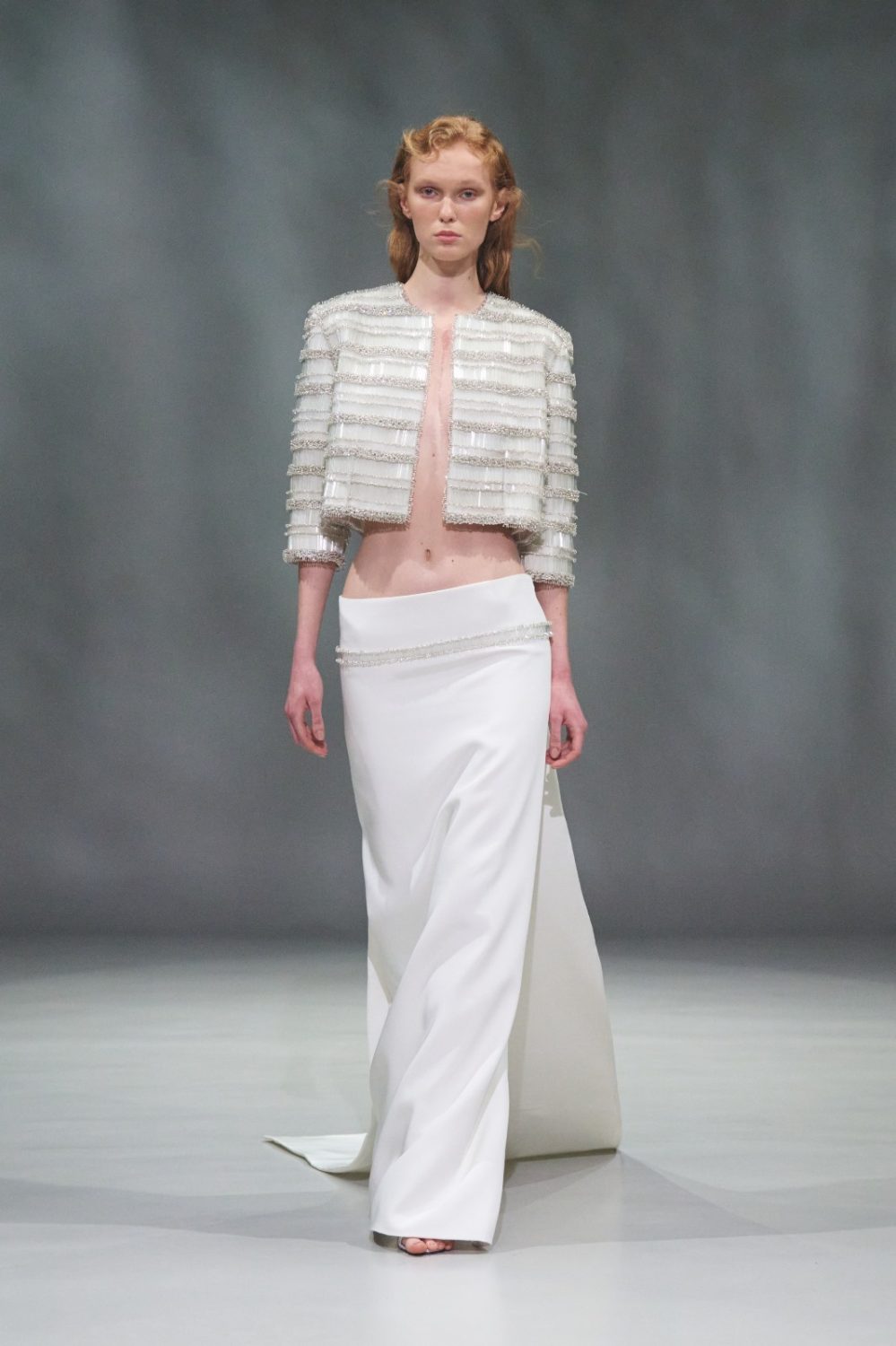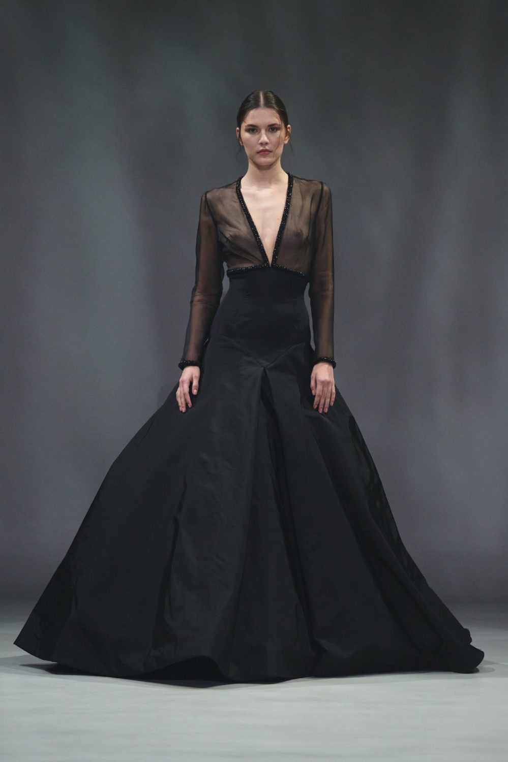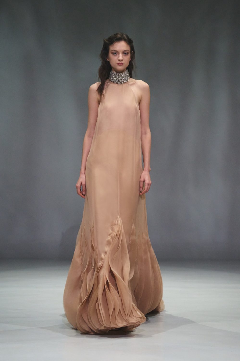 I ricami tridimensionali riprendono motivi naturali come cortecce e radici, mentre busti con baschine ricamate si accompagnano a gonne fluide in organza tagliata al laser. Elementi come frange di cristallo e grappoli di perle aggiungono dettagli ispirati al mondo vegetale. La palette cromatica comprende tonalità neutre come nero, bianco seta e avorio, accostate a sfumature di rosa pesca e glicine.