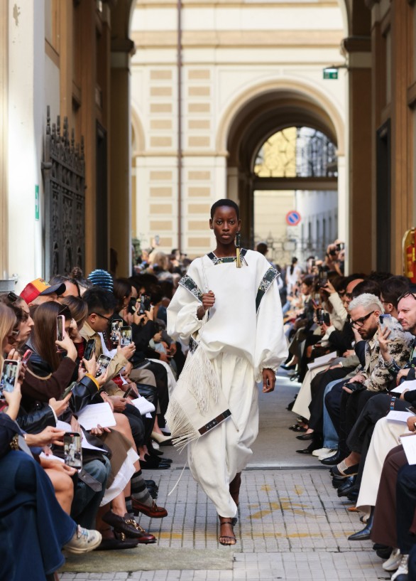 È in questa dimensione sospesa, in un tempo volutamente astratto e in un luogo che appartiene più all’ideale che al reale, che si colloca un viaggio tra passato e presente. Un percorso di stile personale, che intreccia la rigorosa sartorialità maschile con la sottile sensualità femminile, tracciando linee che sfidano i confini tra epoche, culture e memorie. Come fotografie su carta patinata dal profumo nostalgico, custodite ad occhi chiusi nella memoria, prende vita una musa androgina, al tempo stesso adornata, contaminata, fragile e potente. Echi di monili berberi impreziosiscono giacche “strizzatissime”, serrate fino al limite del respiro, in contrasto con blazer che evocano la spensierata eleganza di Ben Volpeliere. Spenser riadattati dialogano con abiti fluidi o pantaloni voluminosi, stretti sul fondo come per trattenere il passo di un’epoca nuova. Nasce così una silhouette inedita, una linea d’identità che non appartiene più a un genere definito, ma all’individualità pura. Non più maschile. Non più femminile. Unica. Perché non tutto è destinato a impressionare. Alcune cose sono nate semplicemente per esistere, in silenzio. In questo dialogo continuo tra passato e presente, Daniele Calcaterra ringrazia chi sostiene la sua visione multidisciplinare, cifra che da sempre appartiene al suo DNA. Con KIWI Vapor ha dato vita a due accessori no gender, punto d’incontro tra tecnologia e moda, tra funzionalità e estetica. E con Cuoio di Toscana ha celebrato il riconoscimento del prestigioso CDT Prize, rendendogli omaggio attraverso la creazione di tutte le calzature che hanno accompagnato la sfilata, radicando così la collezione in un sapere artigiano prezioso e senza tempo.