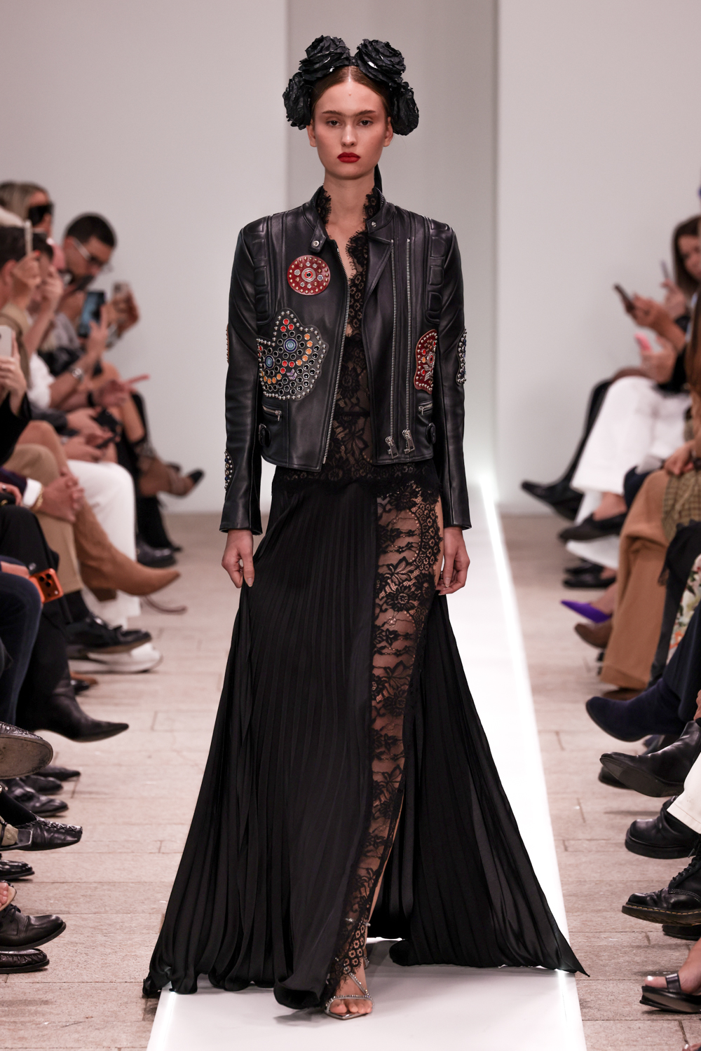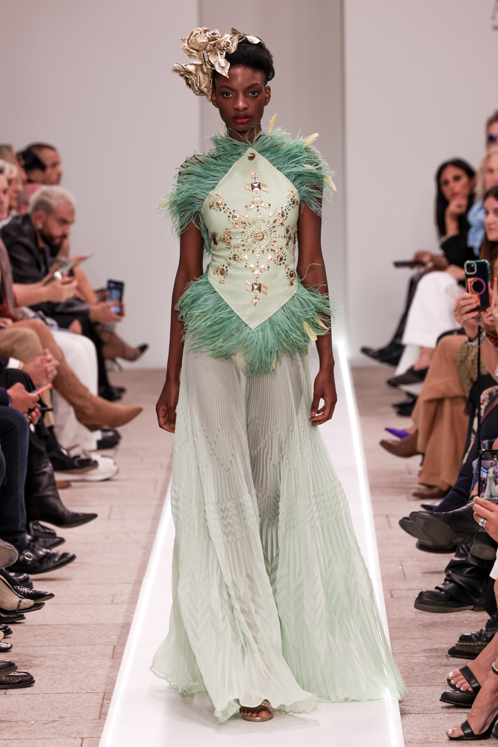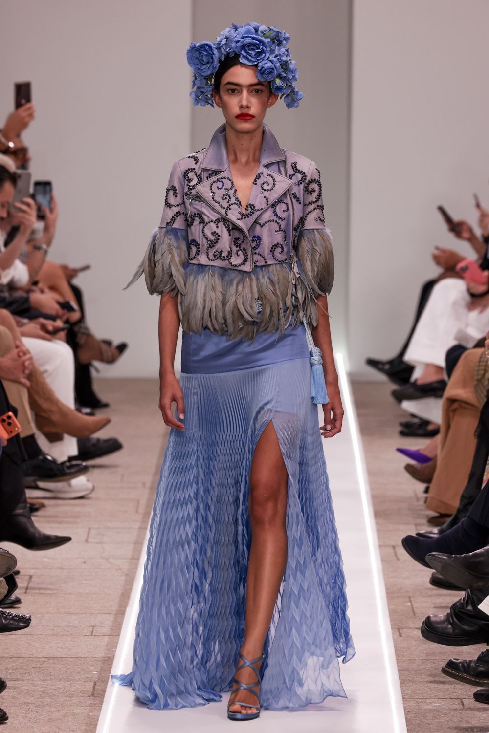 Gli abiti lunghi seguono la lunghezza delle gonne. I giacchini di pelle sono ricamati in materiali ultrapreziosi: piume, strass, swarovski, inserti di pellame con lavorazioni geometriche e contrasti di colore emateriali. I corpini sono realizzati anch’essi con delle forme geometriche bordate di piume in tinta con lapelle, troviamo anche i corpini asimmetrici in cavallino, pelle e camoscio. I gilet smanicati e iper ricamati richiamano nei motivi la figura della Kahlo. La palette cromatica spazia dal nero, nuance cara allo stilista, fino ai bluette, celeste, verde acqua. I colori pastello si aprono in una ruota immensa di plissè conlavorazioni geometriche. Ad impreziosire i look in passerella ci saranno copricapi unici, realizzati interamente a mano da Florilegio con fiori di carta intagliati e dipinti, frutto di un lavoro corale che unisce maestria e visione. I fiori per la Kahlo non erano solo elementi decorativi, ma un mezzo per esplorare e rappresentare la bellezza, la vita e le emozioni, anche quelle più difficili come il dolore, al punto che affermava: “Dipingo i fiori per non farli morire”.