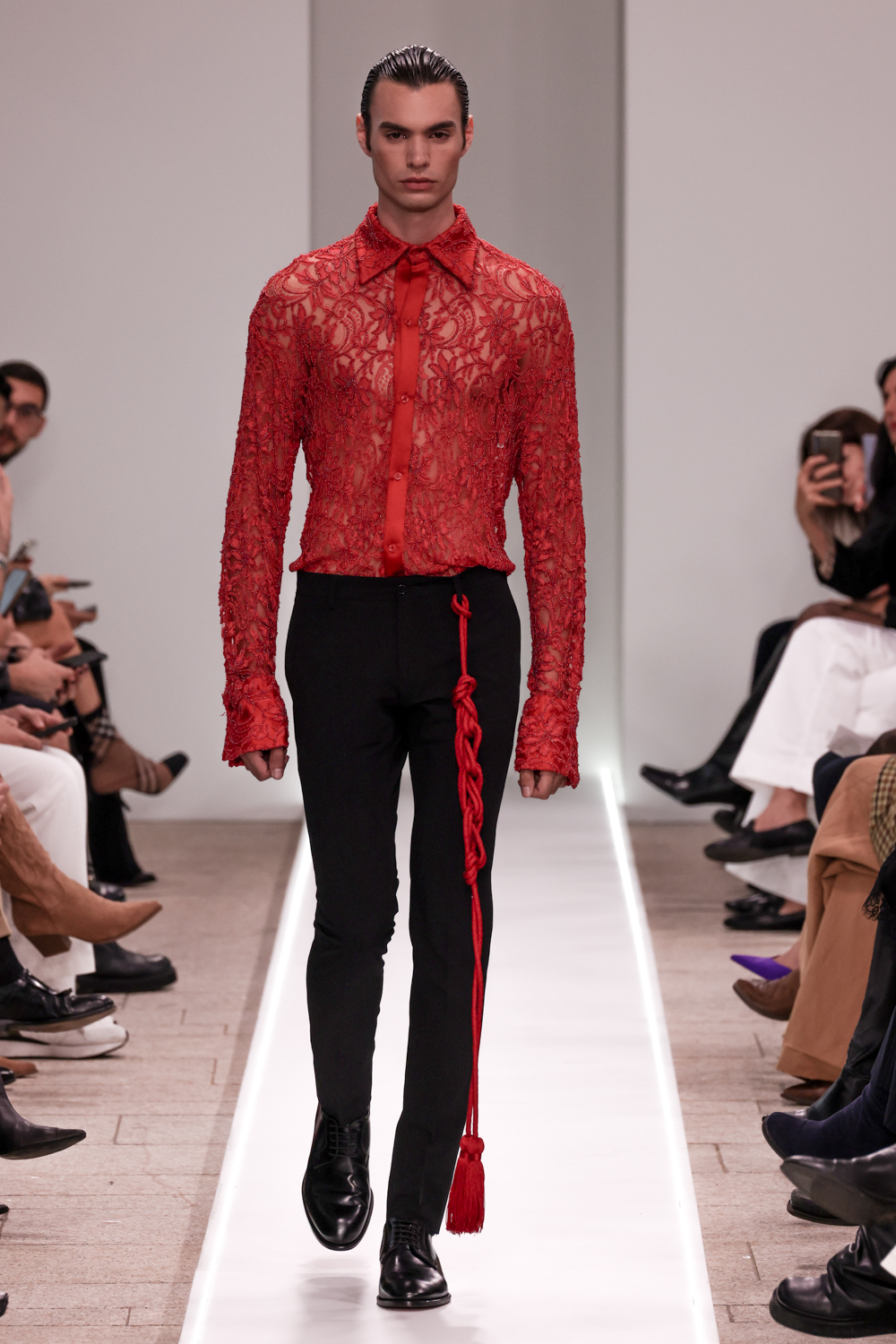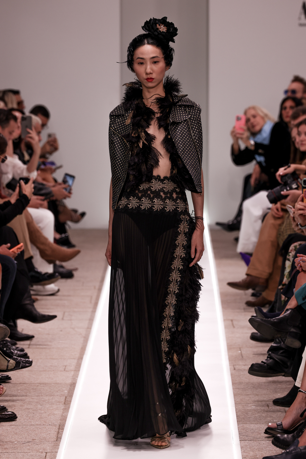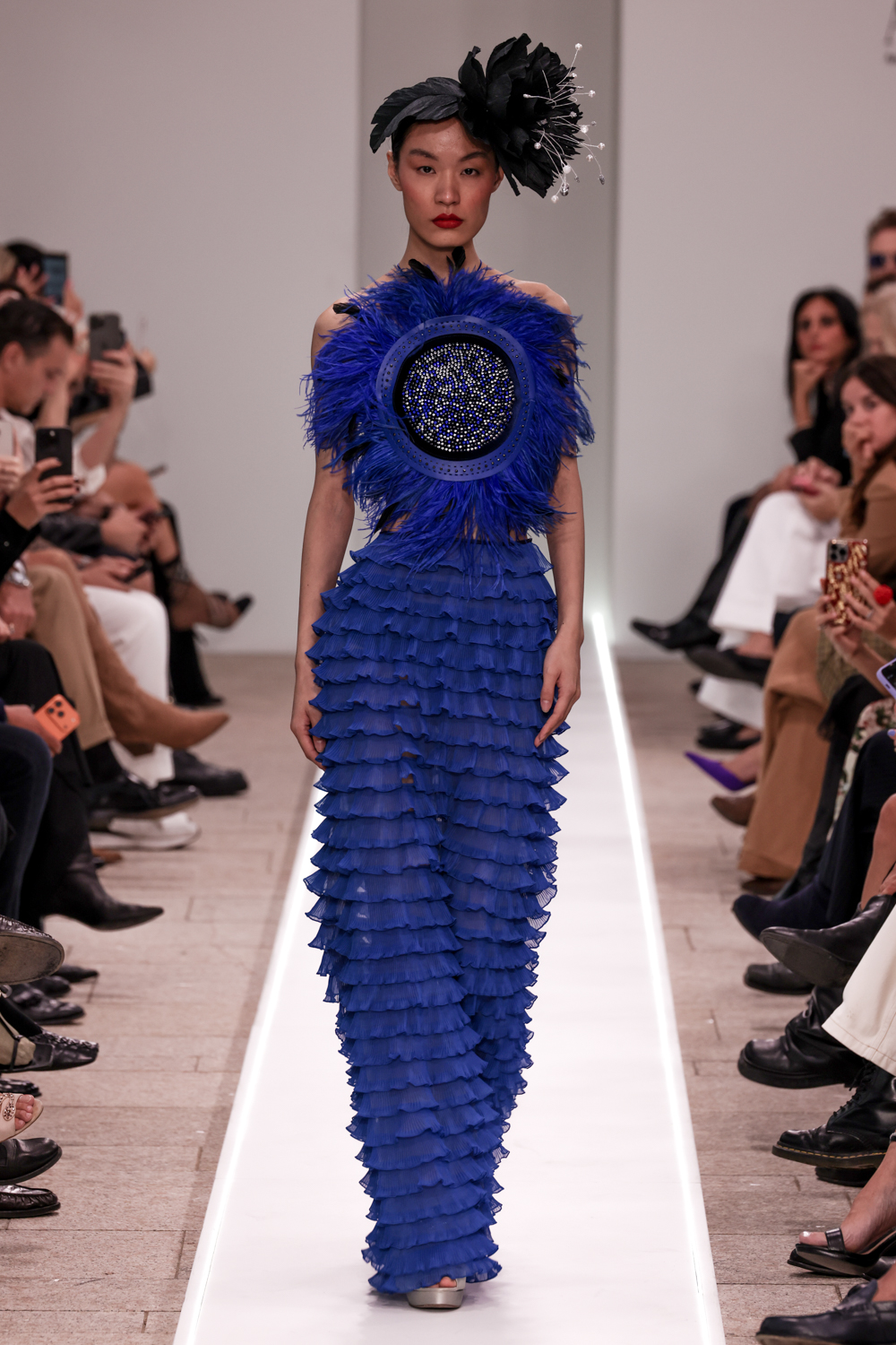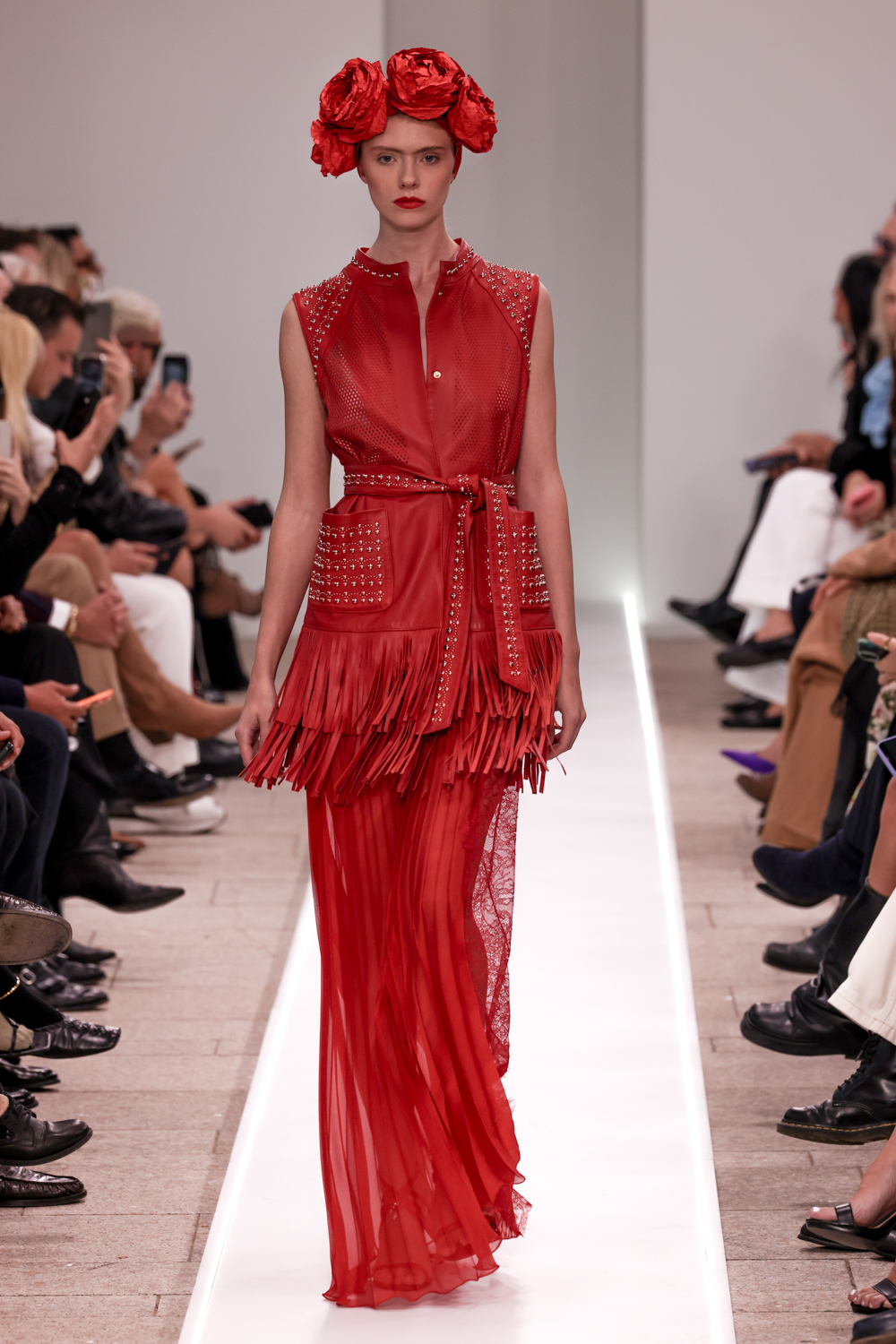 Gli abiti lunghi seguono la lunghezza delle gonne. I giacchini di pelle sono ricamati in materiali ultrapreziosi: piume, strass, swarovski, inserti di pellame con lavorazioni geometriche e contrasti di colore emateriali. I corpini sono realizzati anch’essi con delle forme geometriche bordate di piume in tinta con lapelle, troviamo anche i corpini asimmetrici in cavallino, pelle e camoscio. I gilet smanicati e iper ricamati richiamano nei motivi la figura della Kahlo. La palette cromatica spazia dal nero, nuance cara allo stilista, fino ai bluette, celeste, verde acqua. I colori pastello si aprono in una ruota immensa di plissè conlavorazioni geometriche. Ad impreziosire i look in passerella ci saranno copricapi unici, realizzati interamente a mano da Florilegio con fiori di carta intagliati e dipinti, frutto di un lavoro corale che unisce maestria e visione. I fiori per la Kahlo non erano solo elementi decorativi, ma un mezzo per esplorare e rappresentare la bellezza, la vita e le emozioni, anche quelle più difficili come il dolore, al punto che affermava: “Dipingo i fiori per non farli morire”.