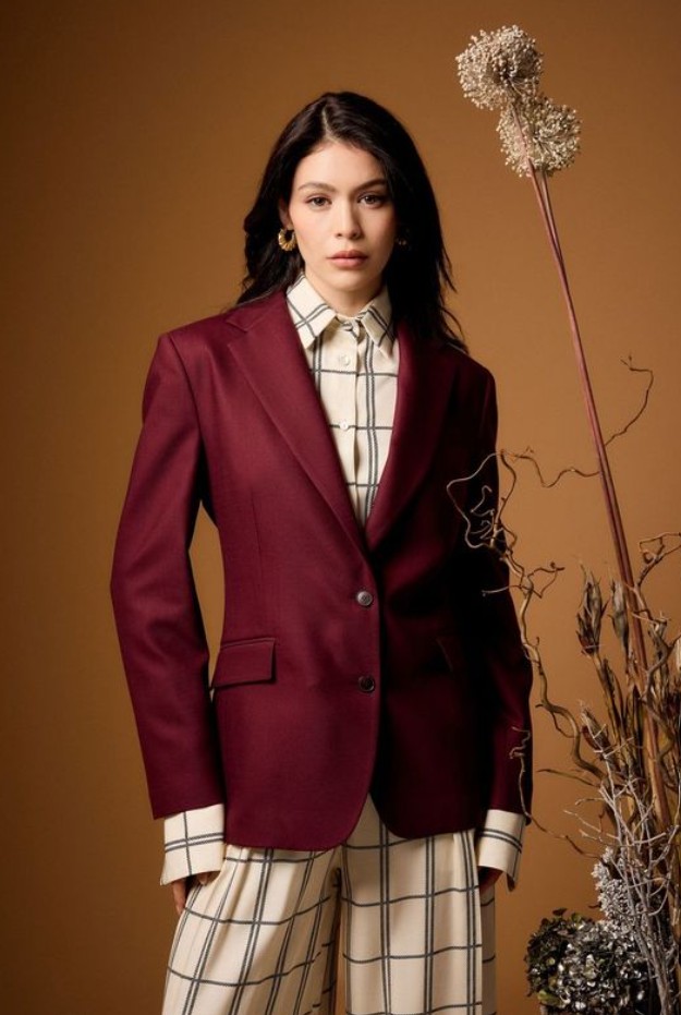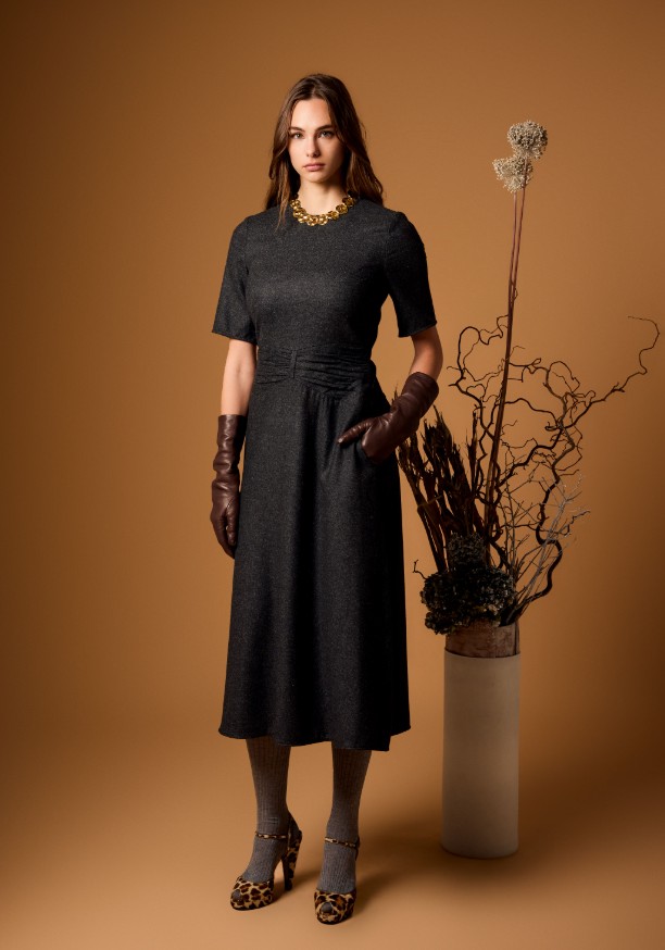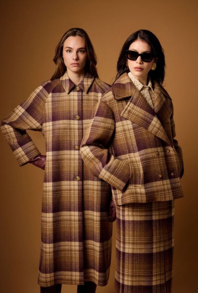 I colori rappresentano la luce e l’anima della collezione. Sete brillanti, gabardine in lana e morbido cachemire danno vita a una palette che spazia dal celeste sky al burgundy, dal grigio sofisticato al tabacco caldo, senza dimenticare il rosso e il rosa, tonalità che da sempre definiscono lo stile Crida. Le fantasie aggiungono carattere e raffinatezza: piccole gocce impreziosiscono gli abiti midi da indossare dal giorno alla sera, mentre lo chemisier diventa grintoso grazie alla seta a stampa animalier. Disegni geometrici finestrati caratterizzano gonne, pantaloni e camicie dal carattere deciso, mentre la georgette impalpabile dona un tocco speciale ai long dress da sera. Per il giorno, il pizzo colorato si abbina a giacche over e coat scozzesi, creando contrasti sofisticati e contemporanei.