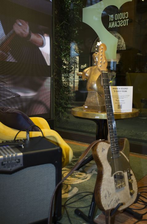 Ermal ha disegnato una chitarra in cuoio in mostra da Robertaebasta a Milano che poi verrà battuta all’asta.