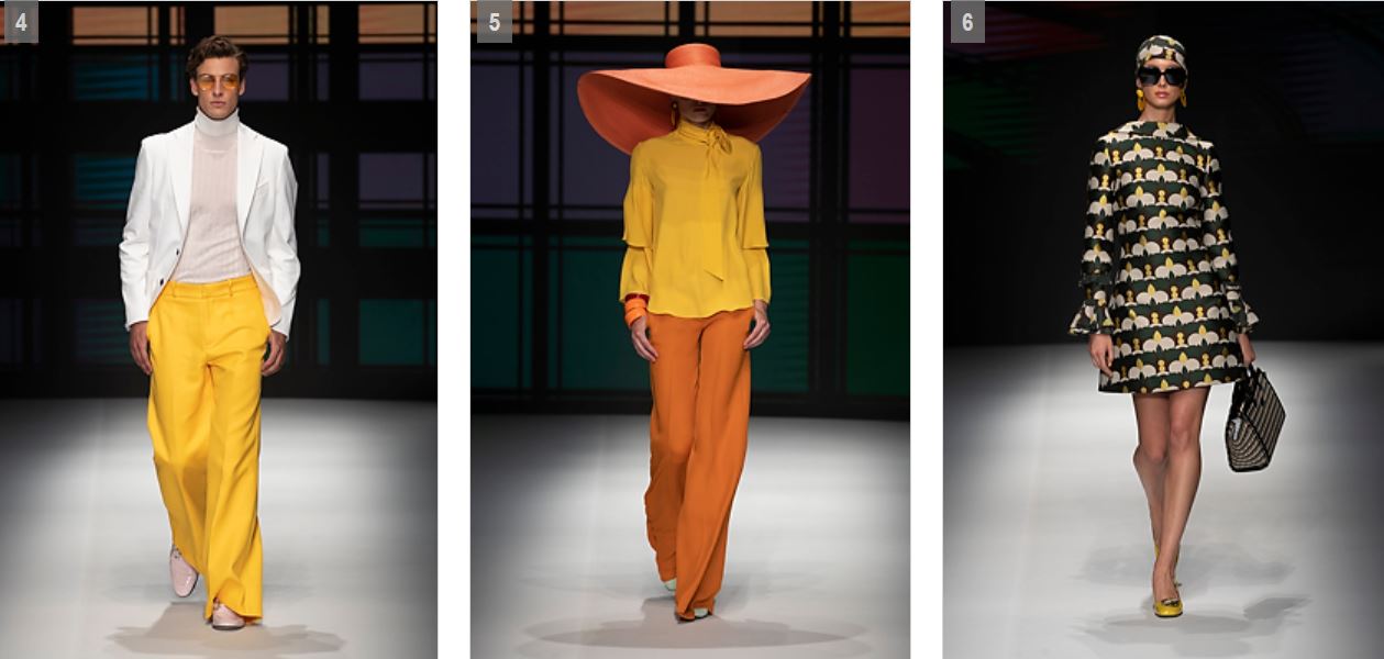 Dal giallo limone al verde bosco, dall’arancione al rosa, passando per punti di light blue e il verde acqua, con gli immancabili bianco e nero. Una palette ampia, che si tinge di nuance vivide e brillanti.