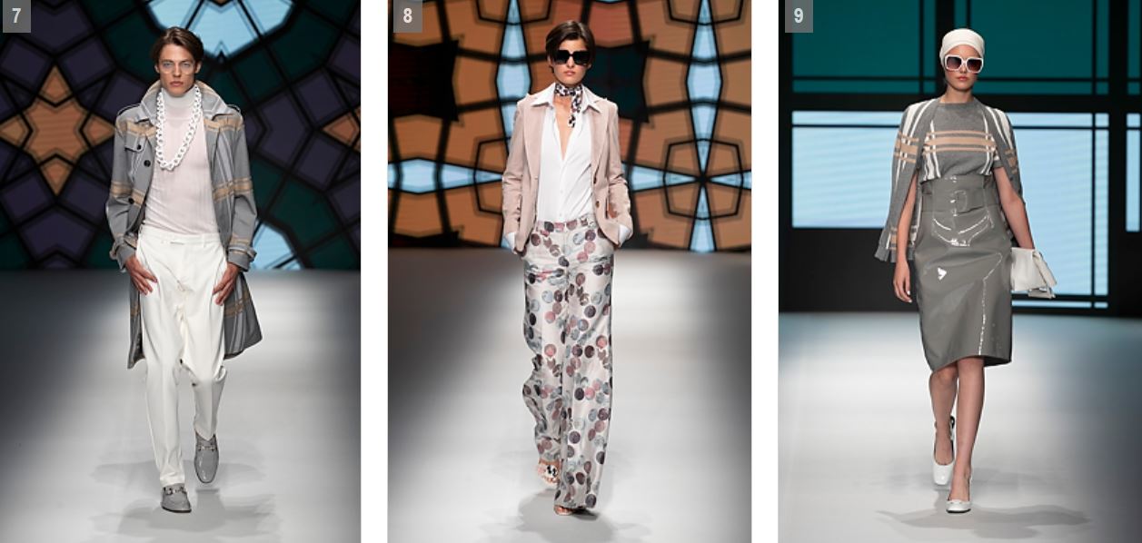 I tessuti sono sempre pregiati, e spaziano dallo chiffon alla georgette, dalla seta ai cotoni più leggerei, fino al crêpe in più pesi, armonicamente mescolati tra loro.