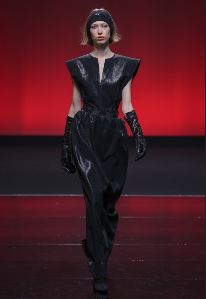 DISIMAN.LING ha fatto un bel debutto a Lineapelle 2025, con una collezione in leather e fantasia moderata, molto ben architettata dal punto di vista cromatico. Un’ambientazione drammaticamente rossa ha fatto da scenario a varie tonalità di nero in passerella. La giovane stilista cinese che rappresenta il marchio ha mandato in defilè una moda futuribile attraverso rieccheggi del passato ispirati alle corti medioevali della Cina.