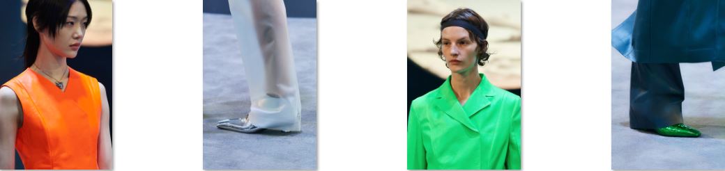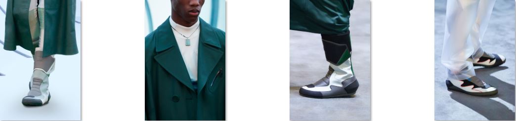 Calzature: stivali space-biker, scuba sneaker, zoccoli in nappa gommata e una reinterpretazione dell’iconico Tacco F di Ferragamo, impreziosita da strass e da una finitura galvanizzata.