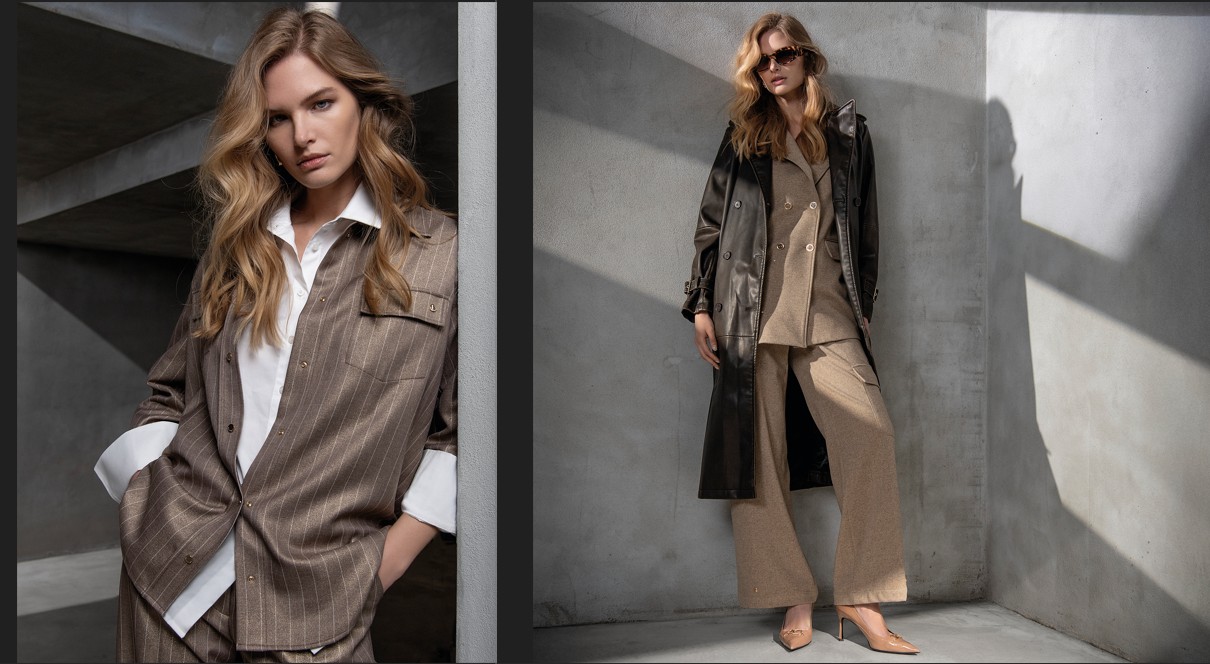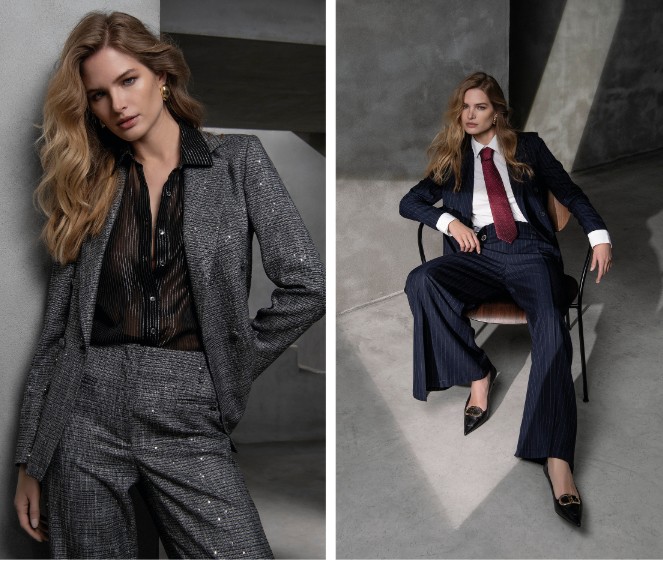 La giacca doppiopetto si conferma protagonista assoluta, indossata con disinvoltura su camicie bianche dal taglio maschile, mentre la cravatta diventa un accessorio di stile e carattere, svincolato da ogni simbolismo convenzionale. I pantaloni si allungano e si aprono con linee fluide, accompagnando il movimento con autorevolezza. I tessuti, strutturati ma morbidi, seguono il ritmo dinamico delle giornate vissute tra riunioni, idee e nuove sfide.