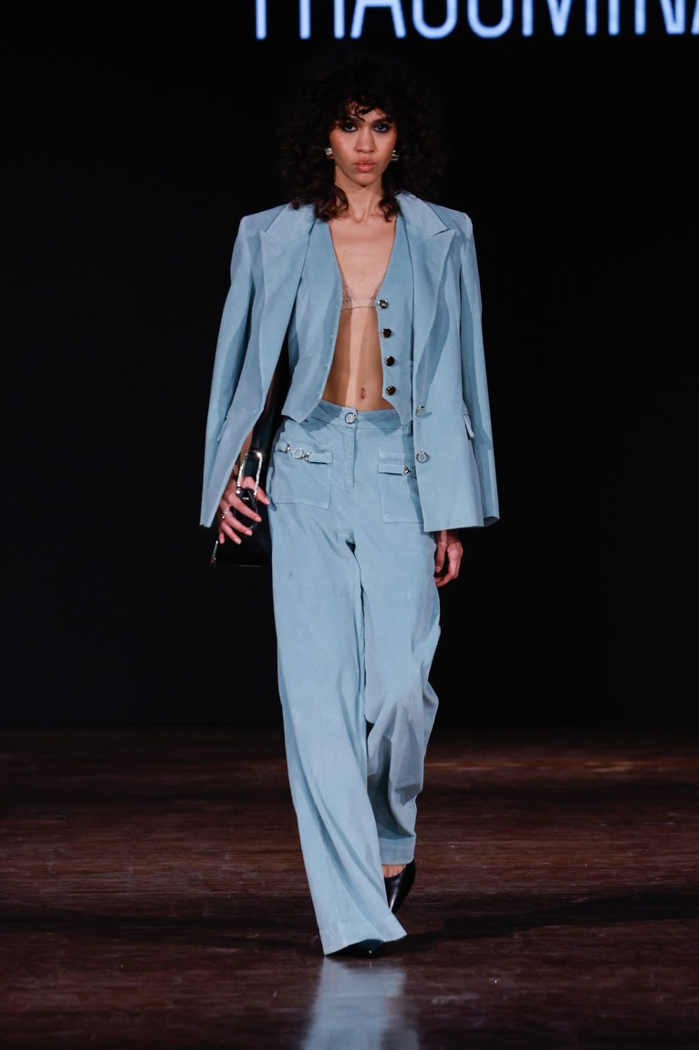 L’ispirazione maschile si declina in chiave contemporanea attraverso completi in gessato e spinato, resi unici da tagli sartoriali e dettagli luminosi. Il denim assume un aspetto inedito con finiture grigio spalmato dall’effetto iridescente, creando un mix equilibrato tra elementi classici e innovativi.