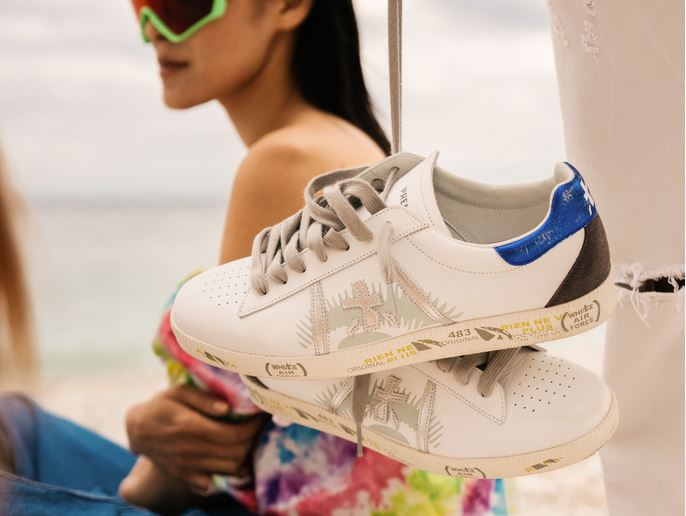 La caratterizzazione della linea ha come emblema un fregio che è la stilizzazione grafica di un’onda increspata o dei raggi del sole sul mare e che accompagna il Logo identitario di PREMIATA. Il modello Andy appartiene all’immaginario del mondo skateboarding, con fondo a cassetta e con diverse varianti di tomaie colorate ma sempre su base tassativamente bianca.