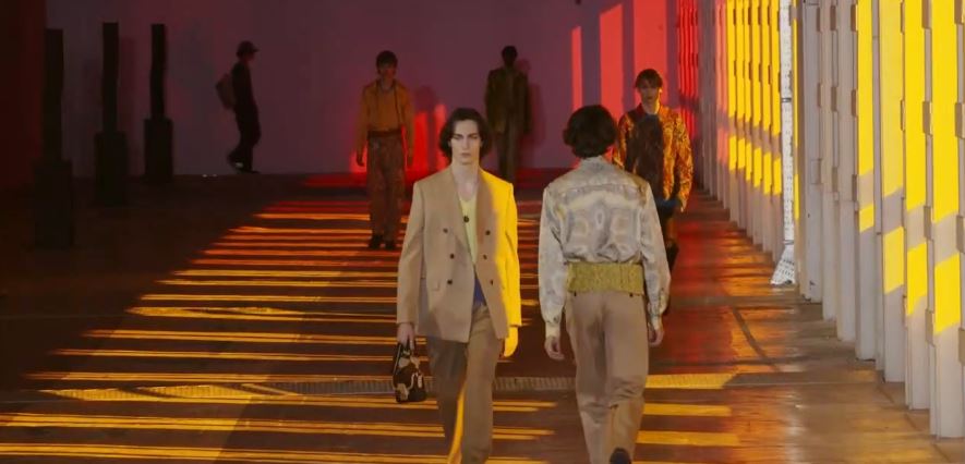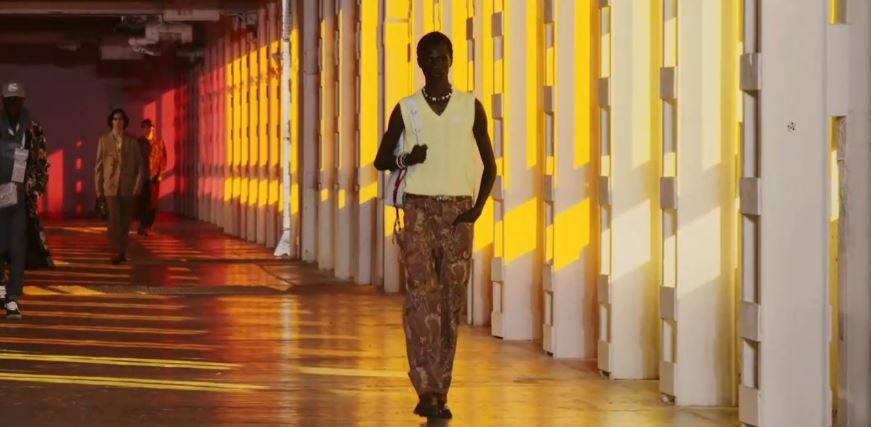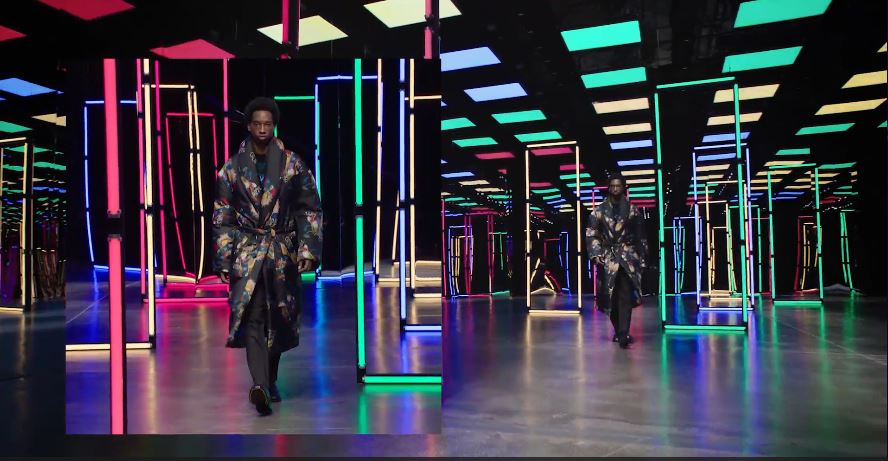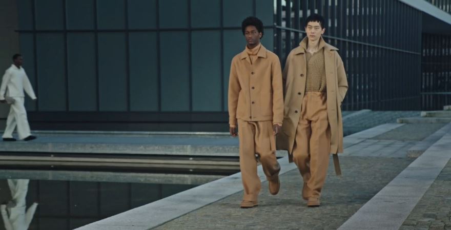 Ermenegildo Zegna ha scelto un’ambientazione architettonica metropolitana di grande fascino che addirittura prevede una sceneggiatura e interazione dei modelli in diverse location. Un video pre-registrato ovviamente, con una cinematografia accattivante che sfrutta anche l’effetto del giorno e notte e la dicotomia tra l’interno e l’esterno della portabilità dei capi. Un effetto che nella sfilata live non si sarebbe mai potuto avere. Così si passa dalla strada alla home disco con estrema naturalezza, ma si sta assistendo a un fashion film, più che a una sfilata.