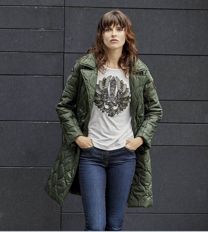 Military Code – racconta una storia vera e propone capi di carattere e senza tempo. Capi basici dal taglio un po’ maschile come giacche, parka e panta cargo vengono affiancati da capi femminili come gonne e vestiti. Punto di forza gli accostamenti inediti: le fibre, le lane, le pellicce vengono infatti arricchite da lurex, paillettes e glitter e le stampe camouflage, da sempre un must have dello stile military, sono rivisitate e declinate in colori inediti e materiali nuovi.