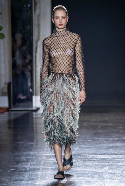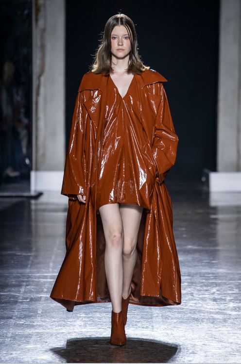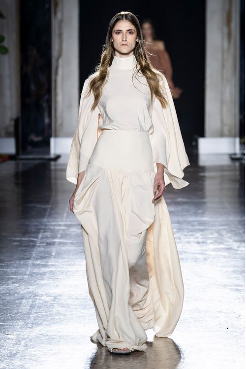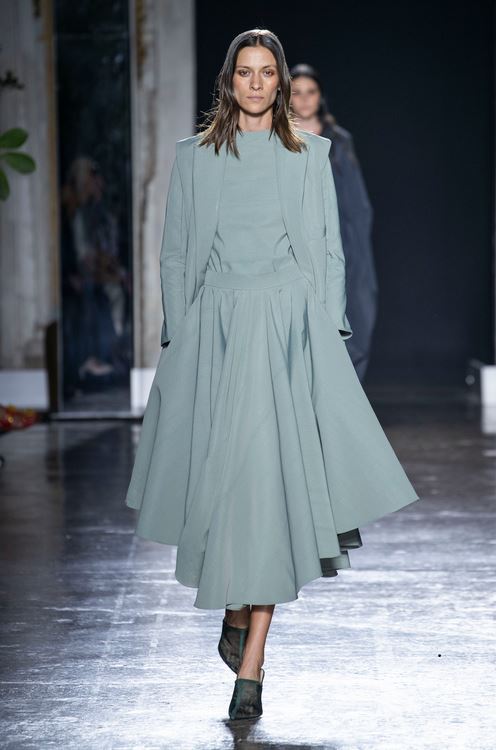 Lo stile “senza sforzo” si aggira per l’’intera collezione che respira, vive tra rami selvaggi e cemento abbandonato che ha il sapore di antiche spoglie industriali. Figure diafane e leggere si muovono come in un’altra dimensione, dove colore, volume e materia acquistano nuove proporzioni.