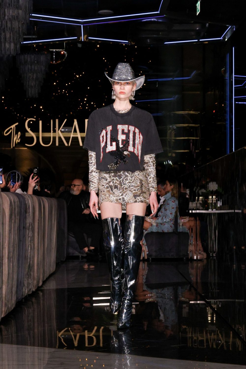 Il punto di forza della stagione è l’eveningwear, in cui ogni look incarna la versatilità di Philipp Plein. Gli abiti da sera sono sensuali e scolpiti, proposti in tonalità accese che riflettono l’energia distintiva del brand. Le nuance più scure delineano un connubio sofisticato tra maschile e femminile, offrendo una gamma di outfit perfetti per un moderno western metropolitano.