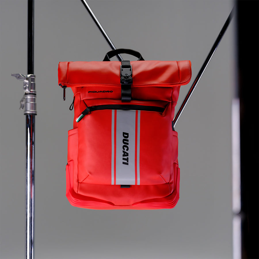 La collezione Piquadro X Ducati comprende due zaini roll-top in tessuto gommato, disponibili nei colori rosso e nero. Ispirati alla linea Piquadro Corner, offrono funzionalità avanzate come comparti per PC e iPad®, resistenza all’acqua, luce portatile e protezione RFID contro le frodi, rispondendo alle esigenze di un pubblico dinamico e attento allo stile.