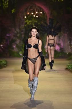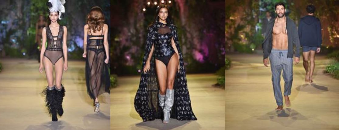 Ad aprire la sfilata, Irina Shayk, la cui potente allure è legata da anni al brand di cui è oggi ambasciatrice mondo, seguita da altre 25 modelle tra cui spiccano per bellezza iconica Isabeli Fontana e Anne V. Sulle note di una suadente colonna sonora sfilano su un tappeto di foglie le fate boschive e le vamp di Intimissimi; la lingerie è accessoriata da leggiadri mantelli di pizzo, stiletto con piume, copricapi da Folies Bergère, in un’alternanza di bianco, nero, maculato, rosso e fantasie fiorate.