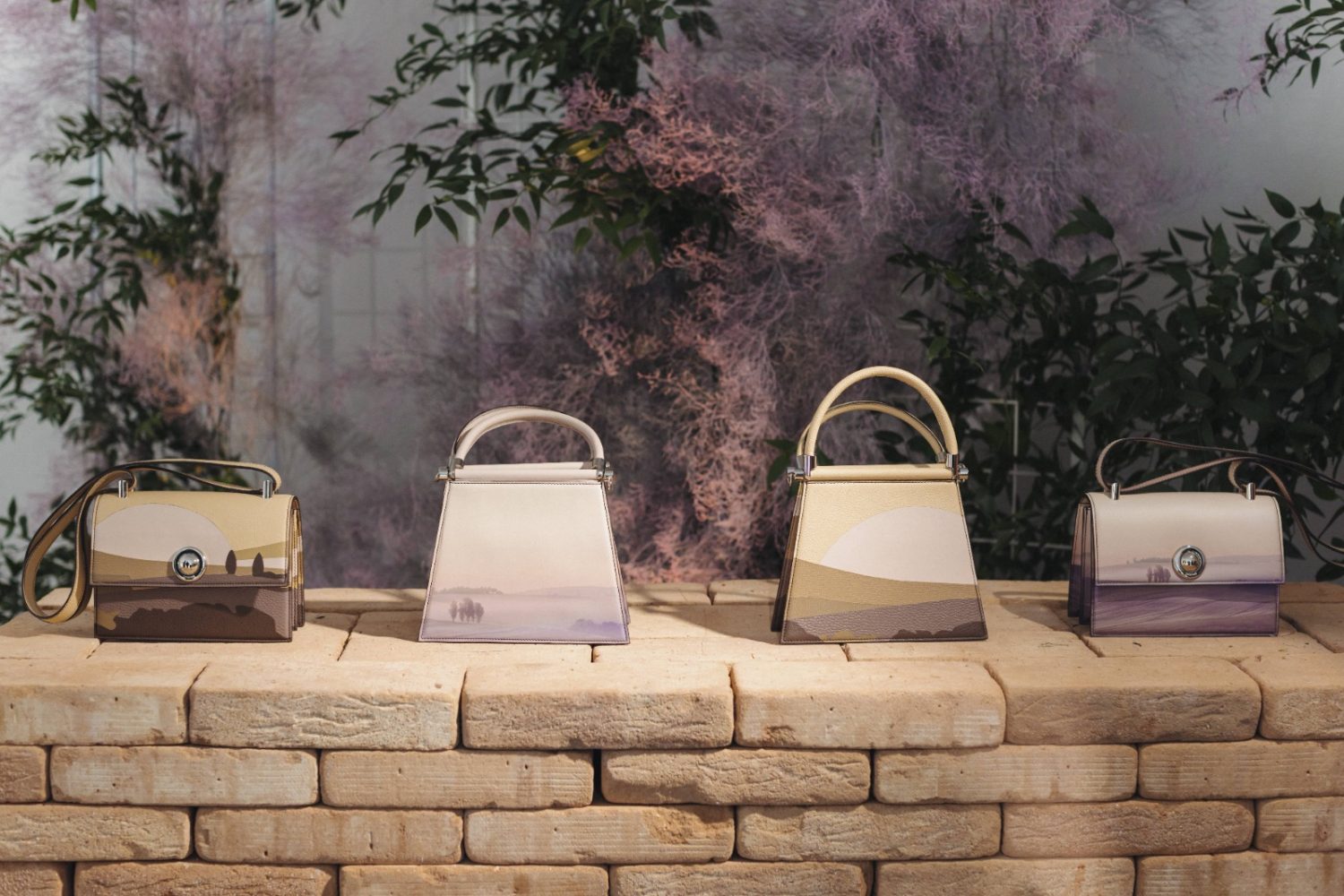 La collezione si ispira ai colori caldi e terrosi dell’alba italiana, con sfumature che richiamano il carminio, il blu del cielo limpido e i toni naturali del paesaggio. Questo omaggio alla bellezza della natura si riflette anche nelle lavorazioni, come la pelle stampata e gli intarsi che esaltano la qualità artigianale dei prodotti.