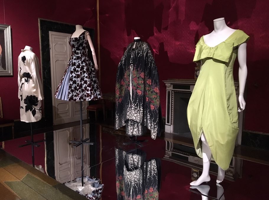 La mostra ora allestita nel Museo della Moda e del Costume, invece, rivoluziona i criteri espositivi finora seguiti per questo genere di eventi: le opere esposte – 107 tra abiti, accessori, dipinti e sculture – non si configurano più per “categorie dominanti” e silenziosi “arredi a commento”, ma dialogano attivamente. Tutti gli elementi presenti diventano protagonisti, rapportandosi gli uni con gli altri, e quindi con la loro stessa immagine riflessa negli specchi che caratterizzano l’allestimento, creando un suggestivo e coinvolgente effetto di dilatazione degli spazi, di replica delle linee e dei colori degli abiti, oltre che di amplificazione delle luci che ne esaltano le forme. La presentazione degli abiti e delle opere d’arte non è precisamente cronologica, perché vuole essere un invito ad una loro diversa lettura, che privilegi le corrispondenze formali, oltre ad evidenziare analogie di ambito culturale.