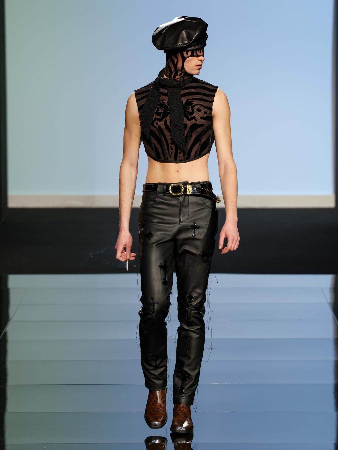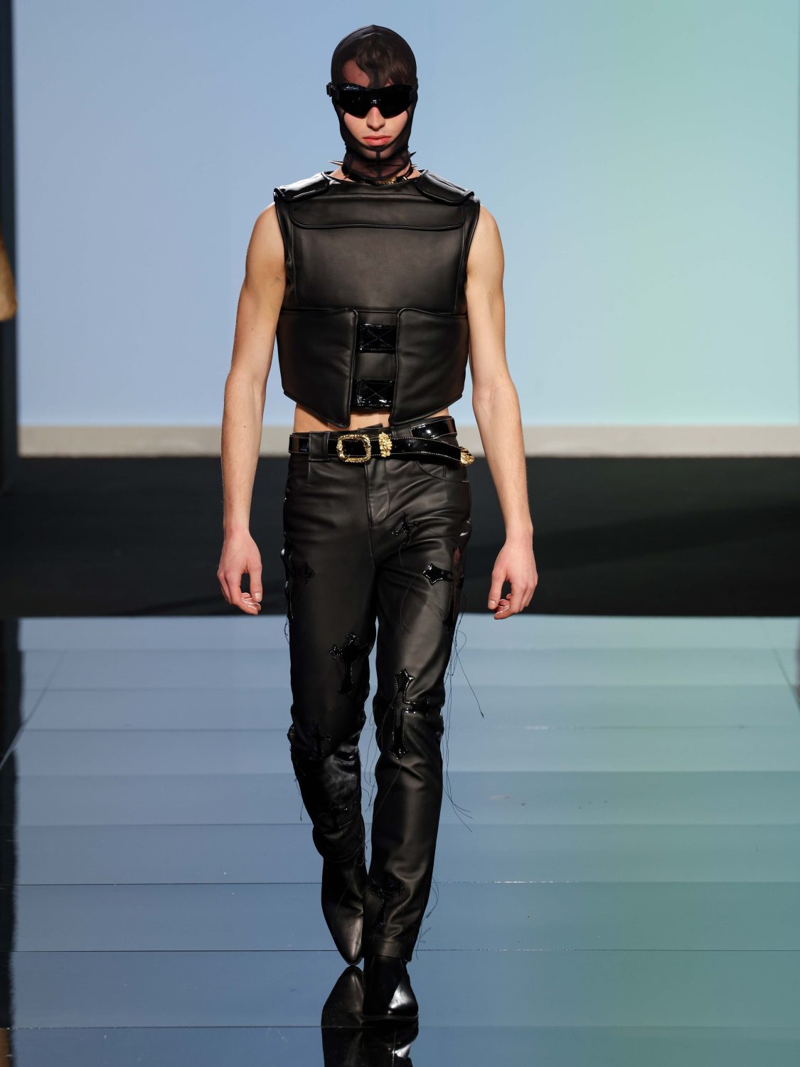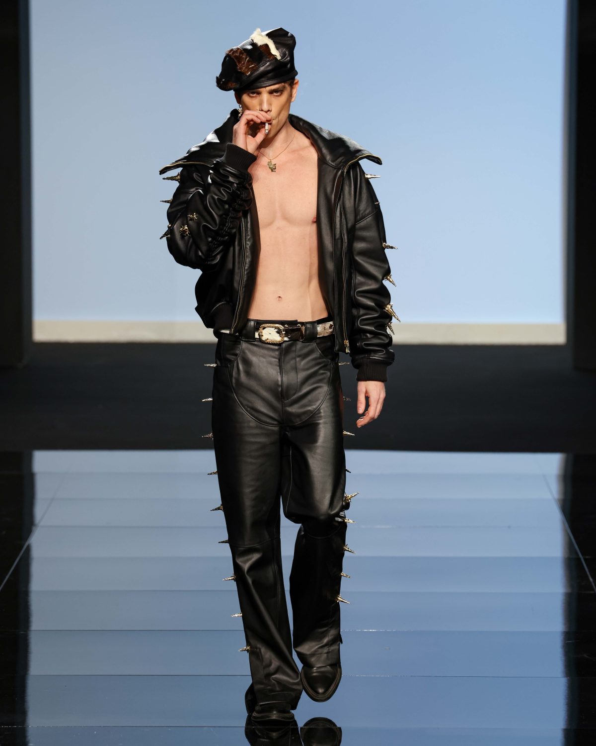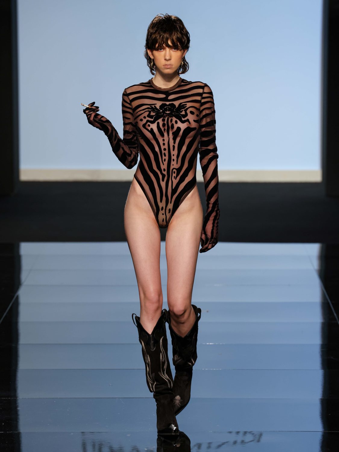 Nei look che hanno sfilato domina il nero animato da intensi accenni rosa shocking, trasparenze bianche e punte dark brown, immancabile il print animalier e i dettagli oro. Gli accessori si ampliano, da copricapi a durag, lavallier e bandane da collo in pelle ricamate, fino alla piccola gioielleria da ciondoli a orecchini, grillz e applicazioni di borchie zebrate su reggicalzini elasticizzati.