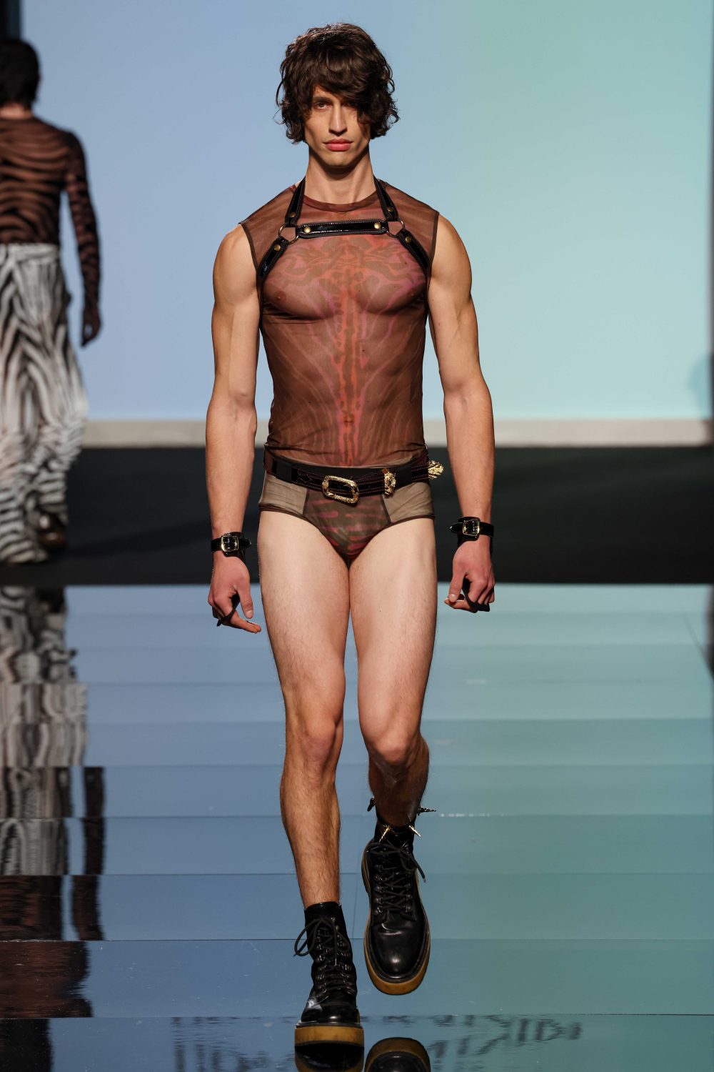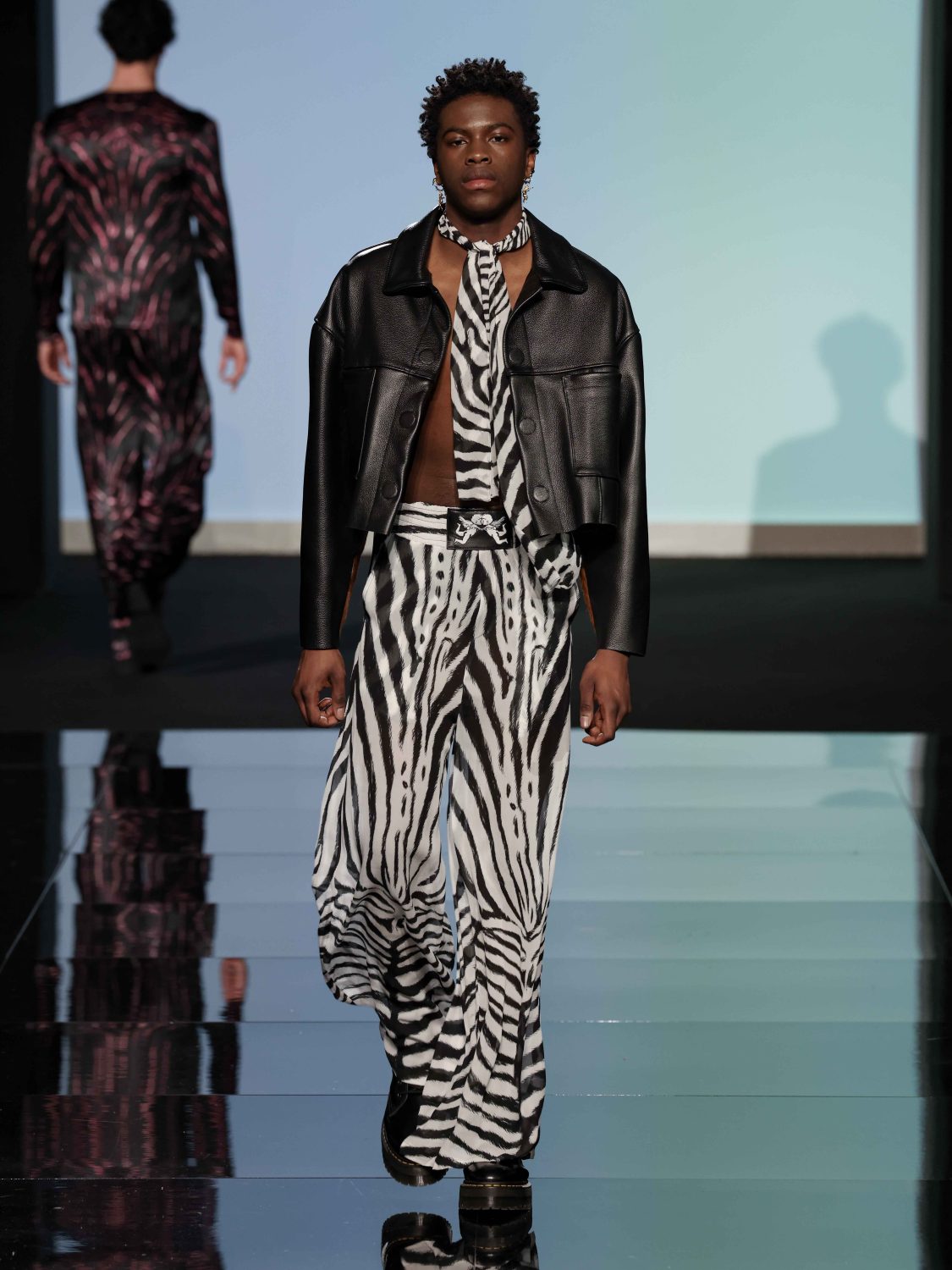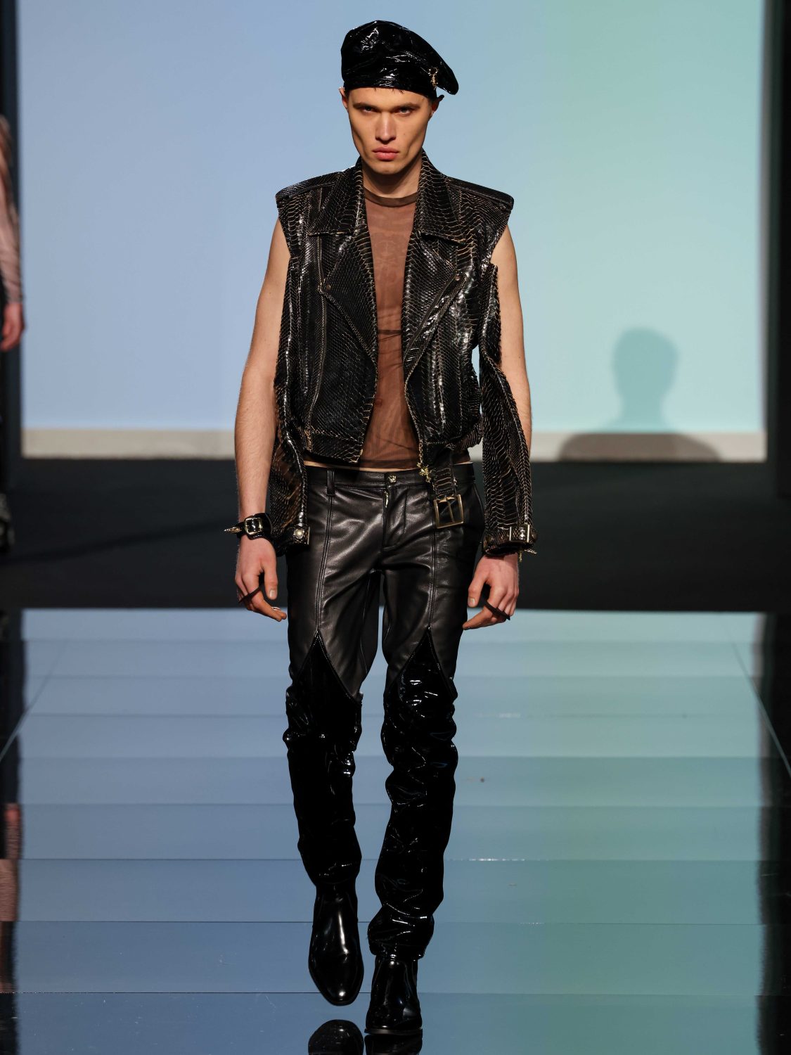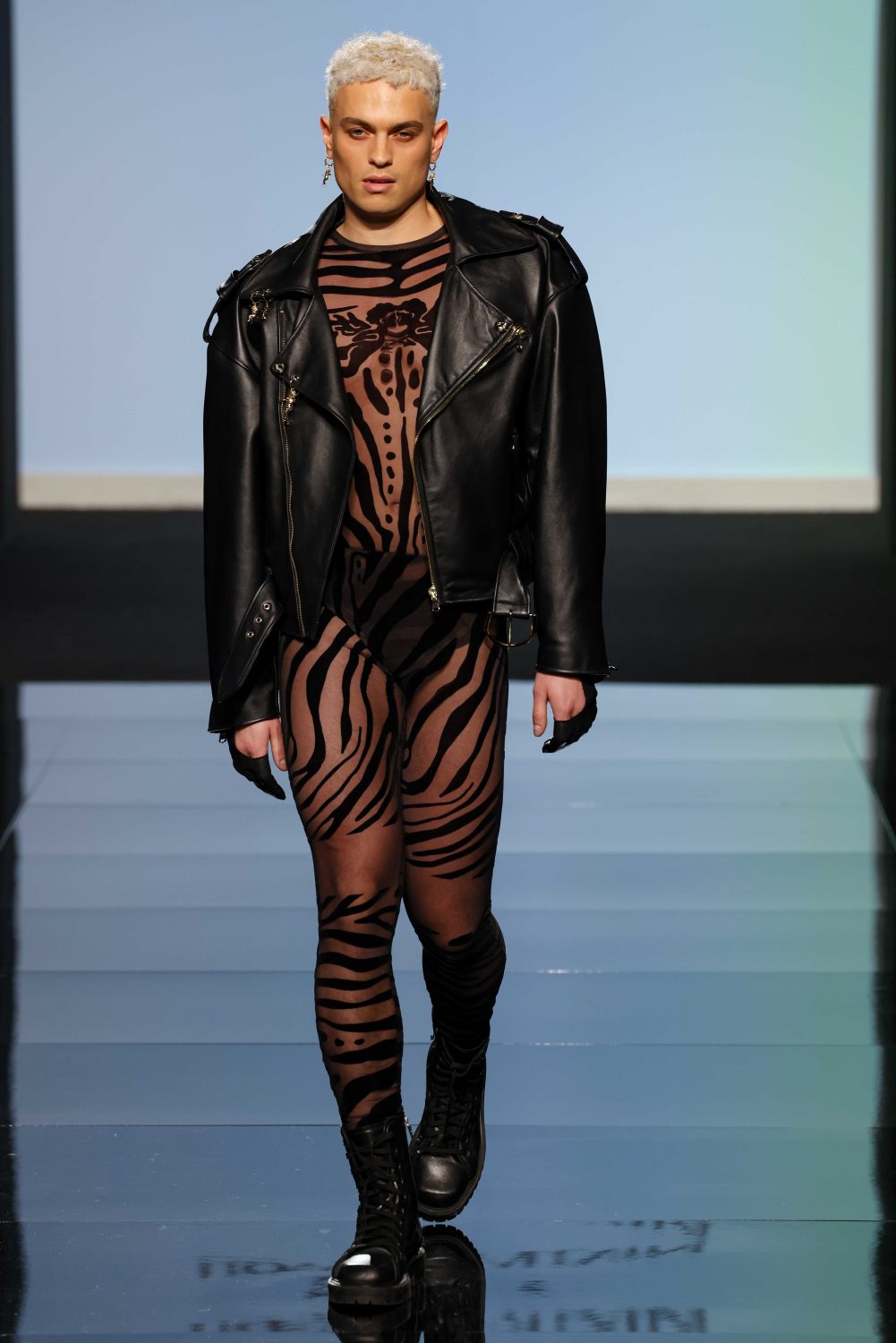 Nei look che hanno sfilato domina il nero animato da intensi accenni rosa shocking, trasparenze bianche e punte dark brown, immancabile il print animalier e i dettagli oro. Gli accessori si ampliano, da copricapi a durag, lavallier e bandane da collo in pelle ricamate, fino alla piccola gioielleria da ciondoli a orecchini, grillz e applicazioni di borchie zebrate su reggicalzini elasticizzati.