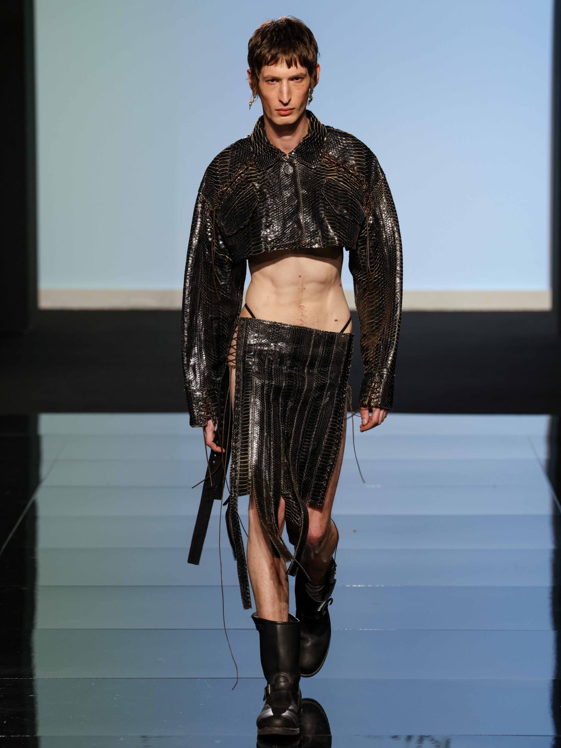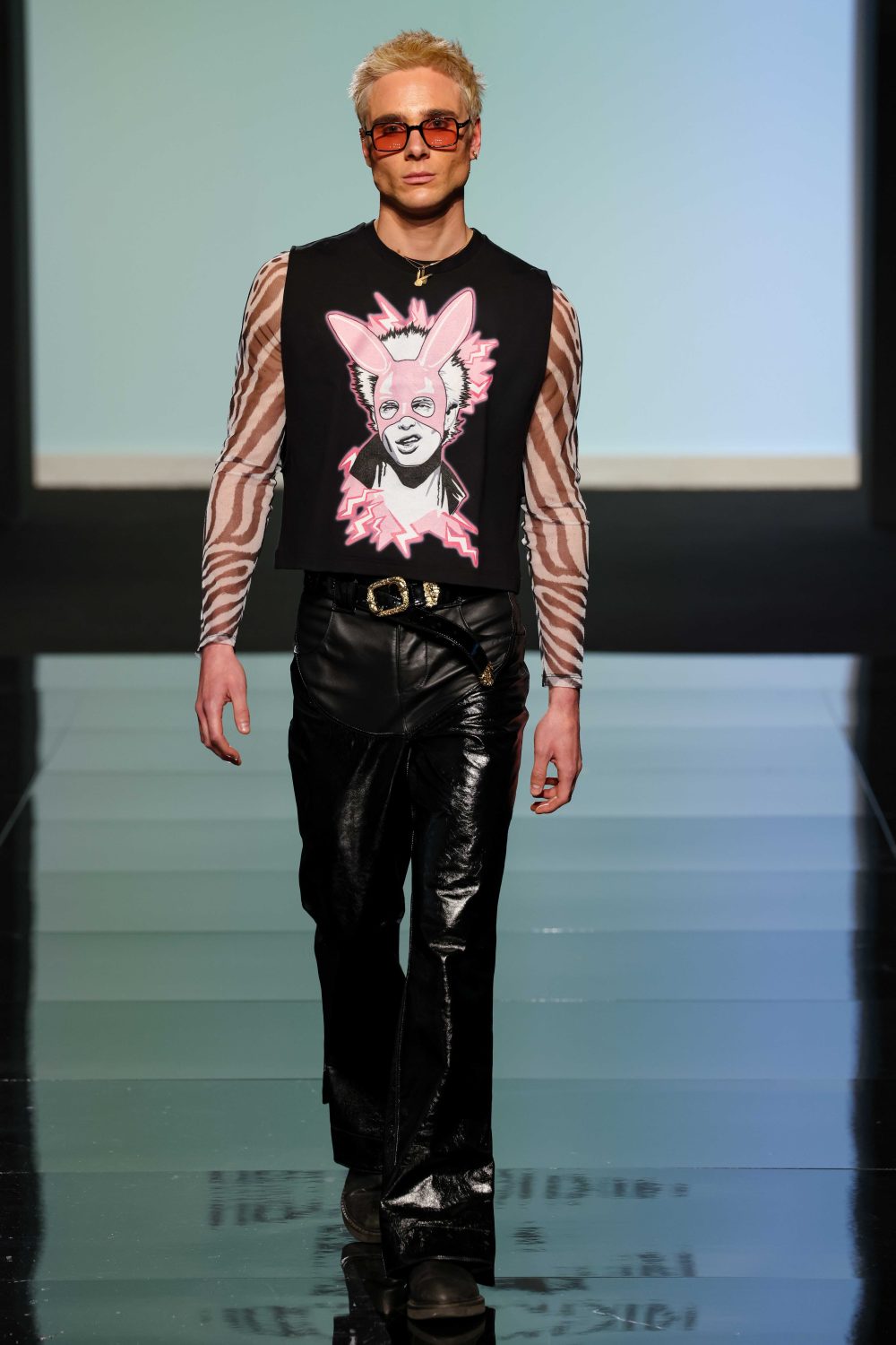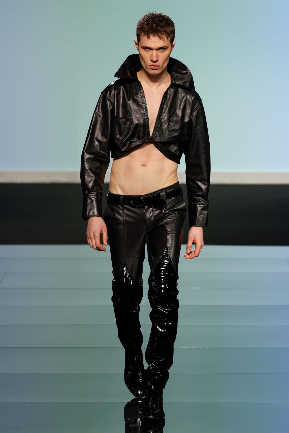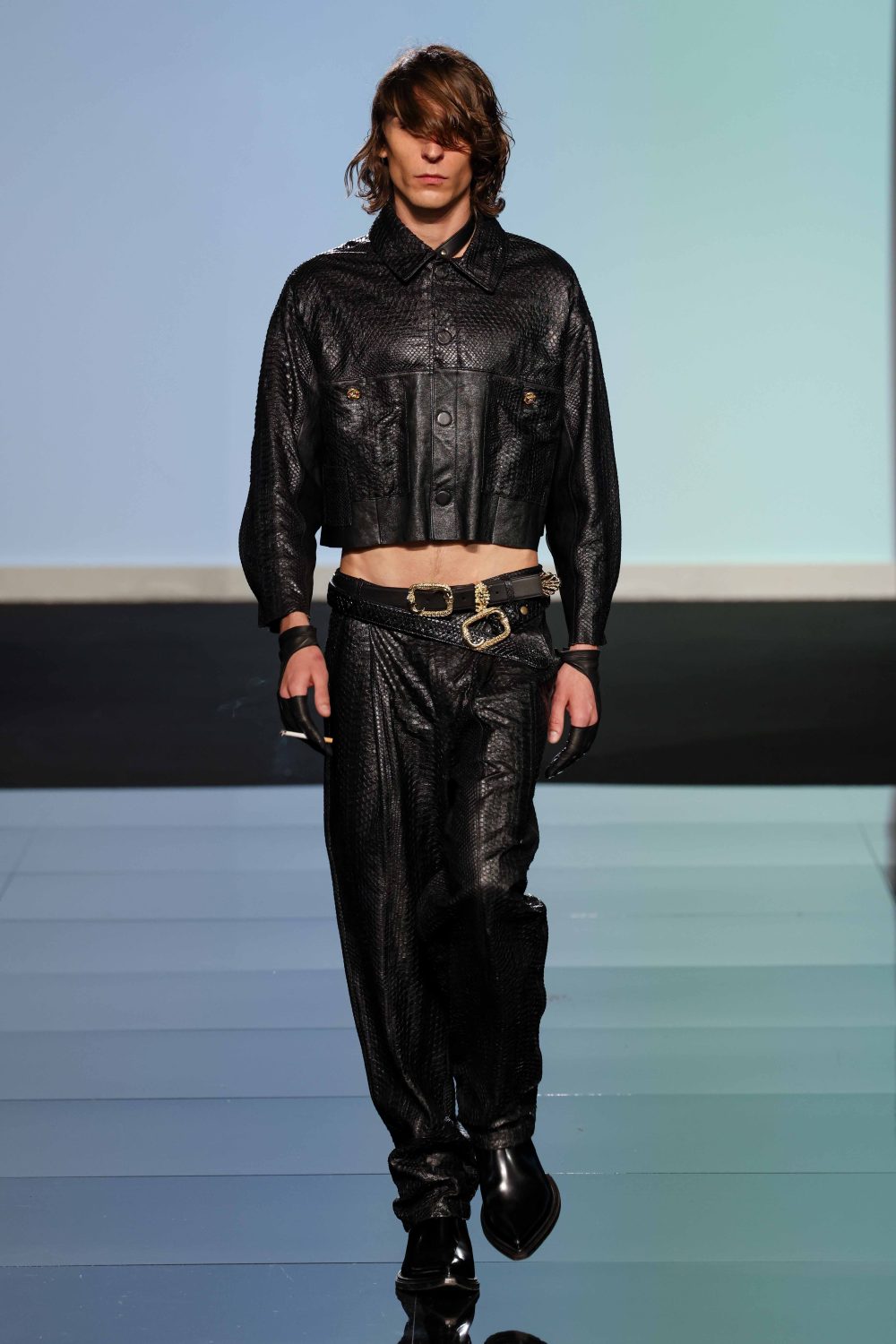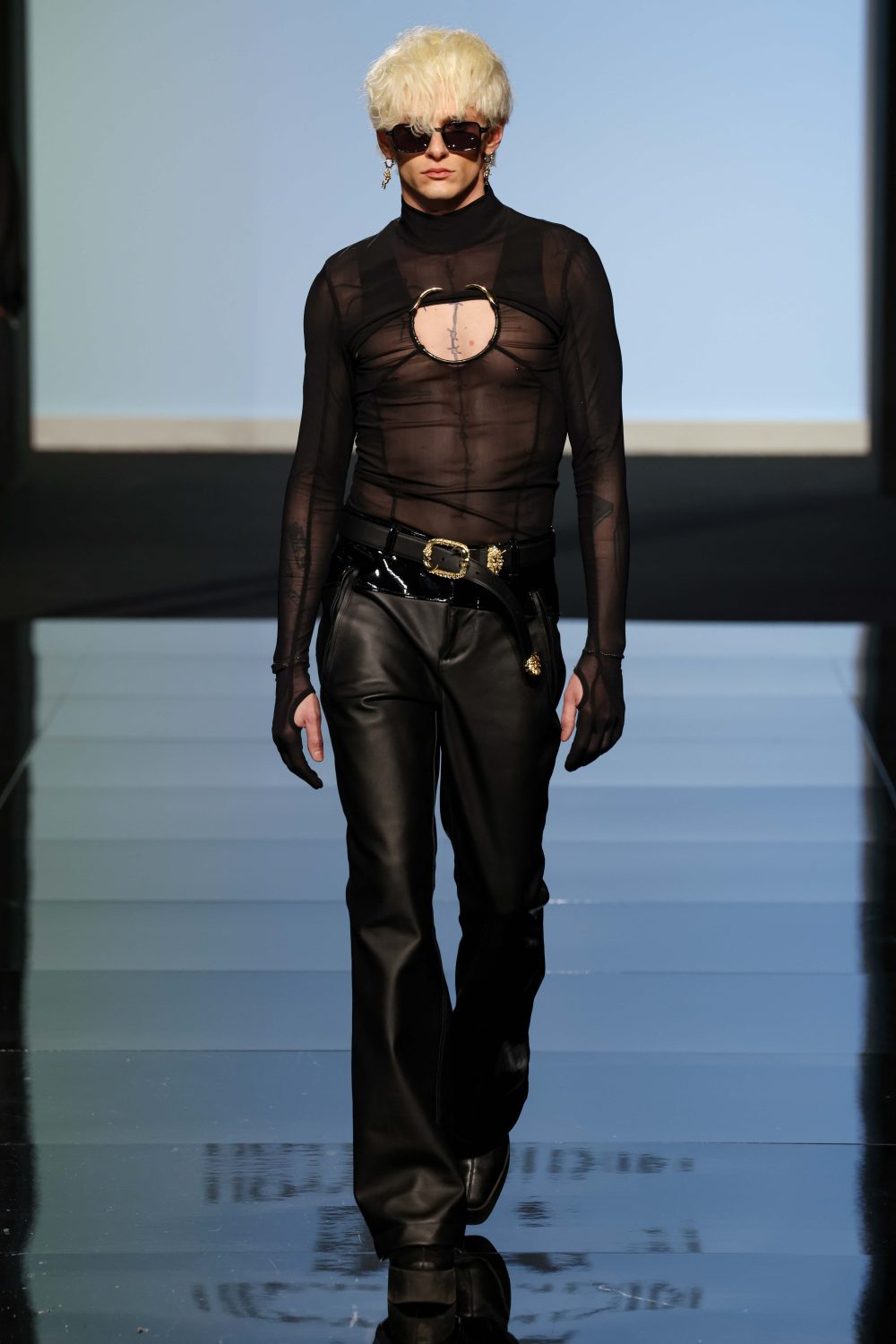 Nei look che hanno sfilato domina il nero animato da intensi accenni rosa shocking, trasparenze bianche e punte dark brown, immancabile il print animalier e i dettagli oro. Gli accessori si ampliano, da copricapi a durag, lavallier e bandane da collo in pelle ricamate, fino alla piccola gioielleria da ciondoli a orecchini, grillz e applicazioni di borchie zebrate su reggicalzini elasticizzati.