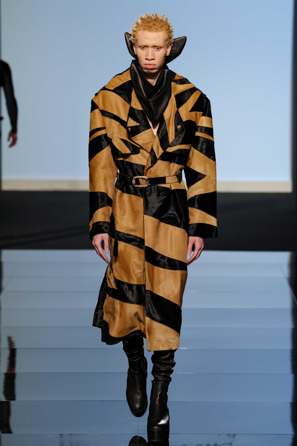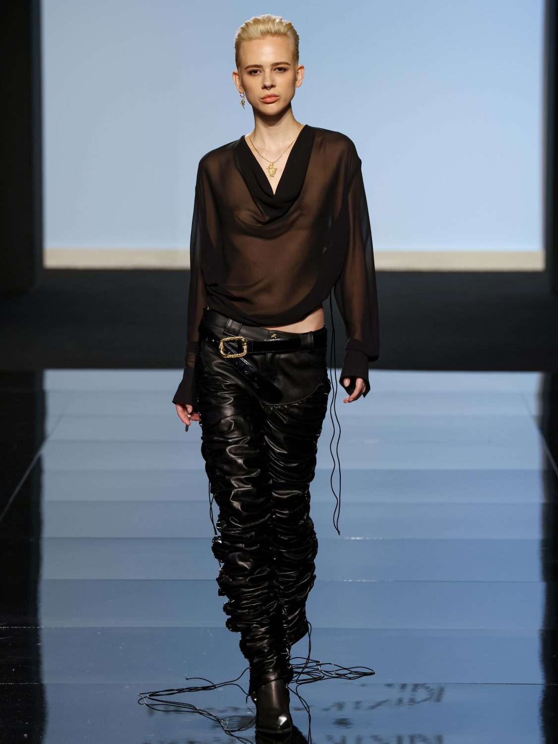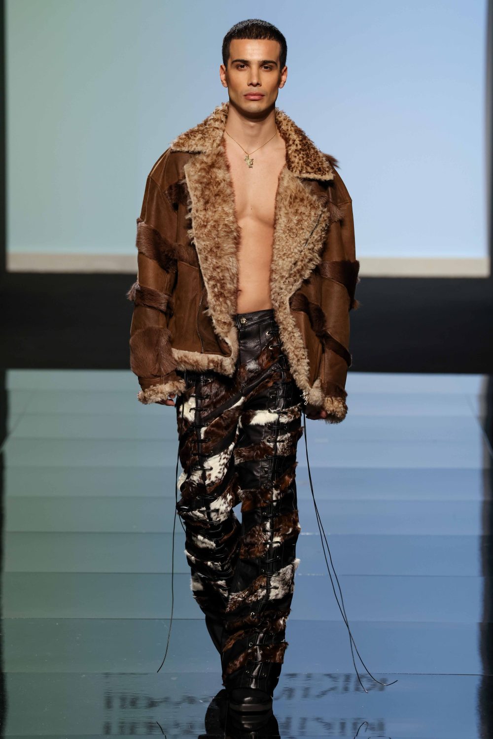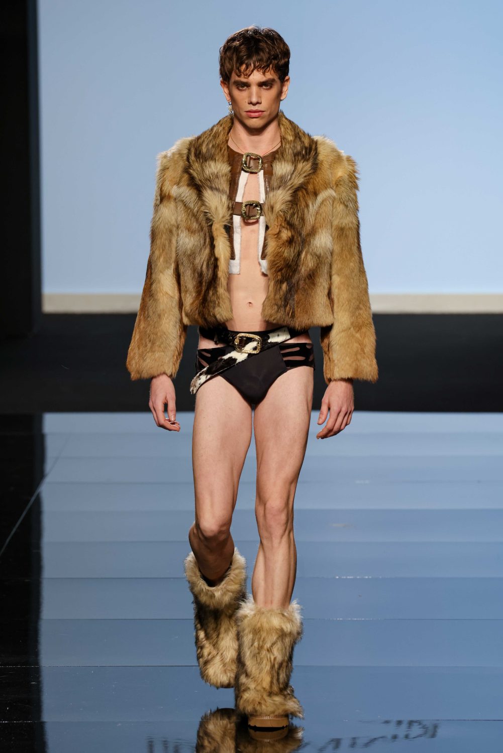 Nei look che hanno sfilato domina il nero animato da intensi accenni rosa shocking, trasparenze bianche e punte dark brown, immancabile il print animalier e i dettagli oro. Gli accessori si ampliano, da copricapi a durag, lavallier e bandane da collo in pelle ricamate, fino alla piccola gioielleria da ciondoli a orecchini, grillz e applicazioni di borchie zebrate su reggicalzini elasticizzati.