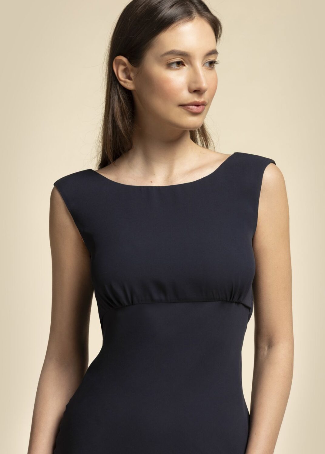 Un abito lungo, in pura seta che scivola come un’ombra elegante, evocando immediatamente le icone, femminili e magnetiche, che popolano le pellicole del grande cinema. La silhouette fluida e il taglio minimal rivelano un’intelligenza sartoriale che non ha bisogno di gridare per sedurre. L’alta manifattura e una particolare lavorazione del tessuto garantiscono ampia vestibilità e la possibilità di indossarlo senza aperture o antiestetiche zip. Sulla schiena un elegante scollo a cappuccio mentre la discreta scollatura frontale presenta un delicato arriccio sopra al taglio impero. La lucentezza della pura seta in blu navy esalta con raffinatezza l’intera figura: è l’abito perfetto per una donna che si muove tra gala esclusivi e sofisticate soirée. A completare il look, il sandalo dal design essenziale in pelle blu con cinturino alla caviglia.