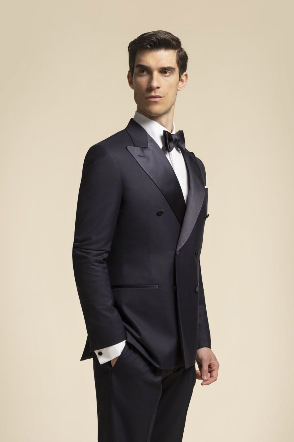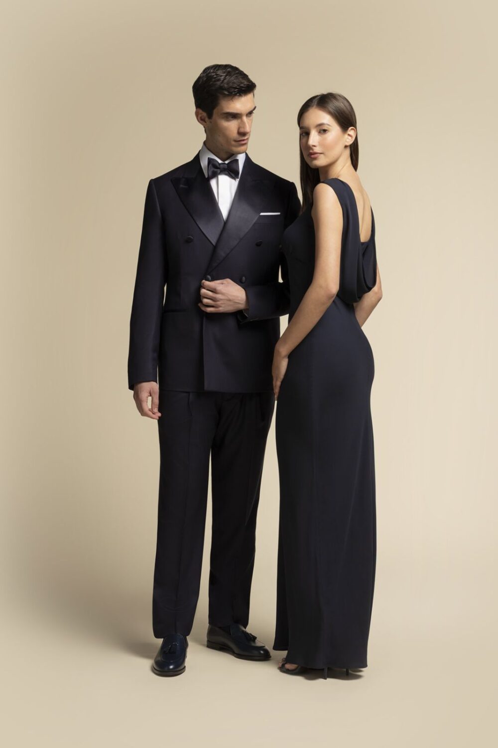 Un inedito smoking, non nel classico nero bensì in blu navy. Un completo per serate eleganti, da indossare rigorosamente dopo il tramonto, per un uomo che non si limita a vestire l’eleganza ma a viverla a pieno come stile di vita. La giacca doppiopetto in frescolana con dettagli in raso di pura seta come il rever e i copri bottoni, i pantaloni sempre in frescolana con bottoni in corozo tono su tono e fascia in raso di pura seta che richiama il rever della giacca. Camicia in puro cotone dalla mano piena e corposa, pensata per l’abbinamento con lo smoking. Il capo è reso più formale da alcuni dettagli: cannoncino con bottoni nascosti, collo all’italiana ideale per farfallino e polsi con predisposizione per il gemello. Farfallino classico da annodare in raso di pura seta, pochette in puro cotone e mocassini in pelle blu con nappine completano il look.