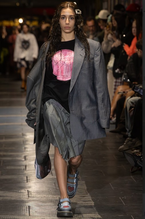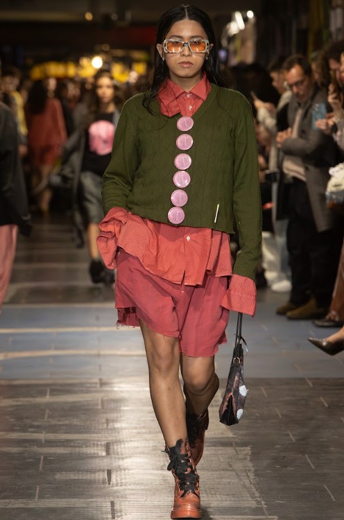 L’energia reale arriva dalla forza del pensiero comune: questo è il presupposto del fashion show di Simon Cracker che al suo fianco vuole soprattutto condivisione. Si sono visti membri di una comunità sfilare con vestiti che davvero appartengono al mondo comune dello stilista: fatto di persone differenti, con vite opposte, che si riuniscono in questo momento condiviso con tutti.