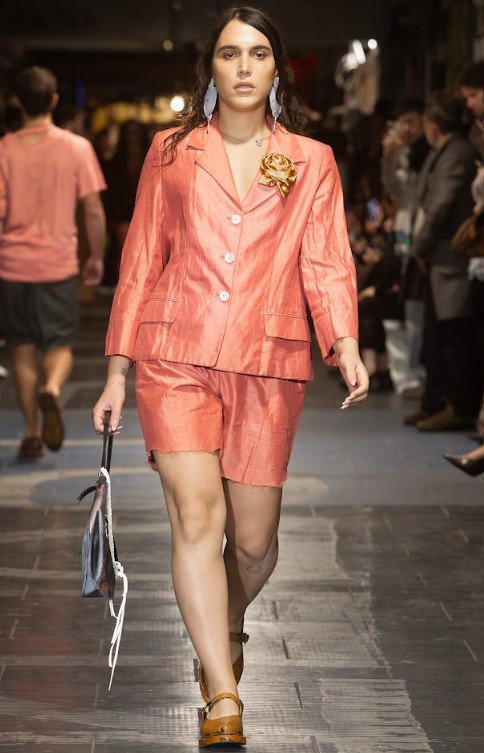 le giacche sartoriali moltiplicate per due in volume. I toni ridondanti sono l’arancio terracotta, in cui cui abbiamo immerso parte dei capi, che sono poi usciti in una scia di sfumature diverse dettate dal tessuto differente per ogni pezzo.