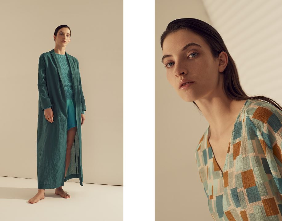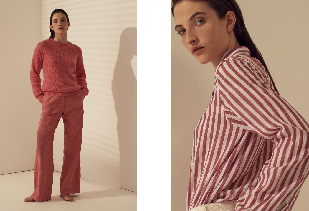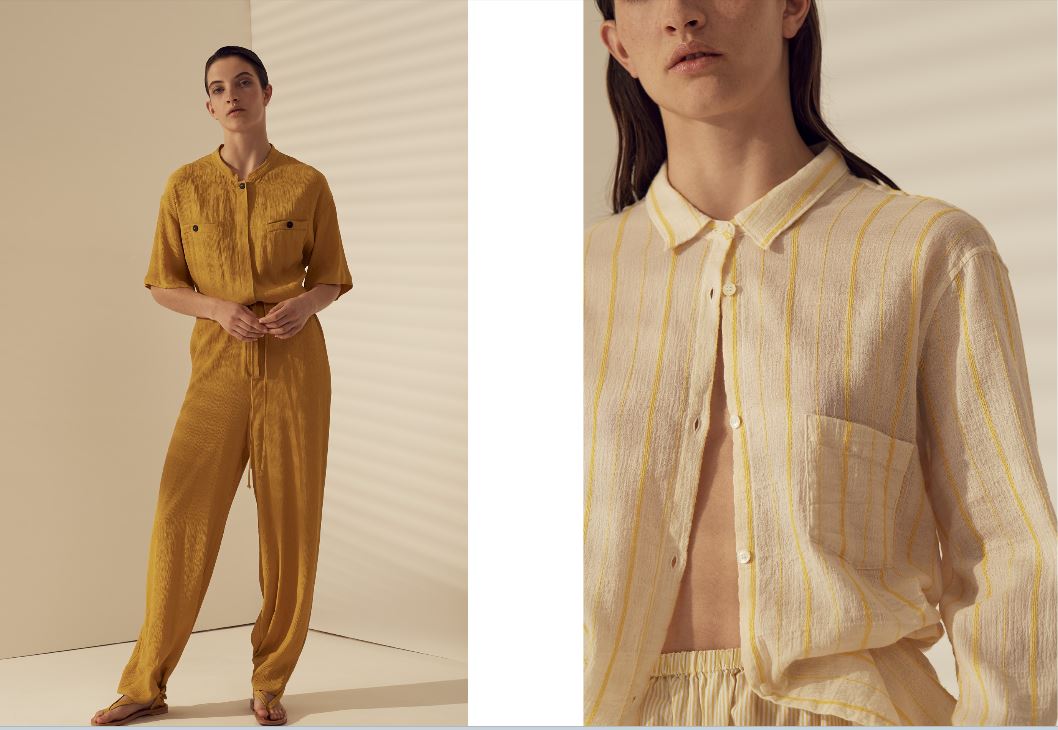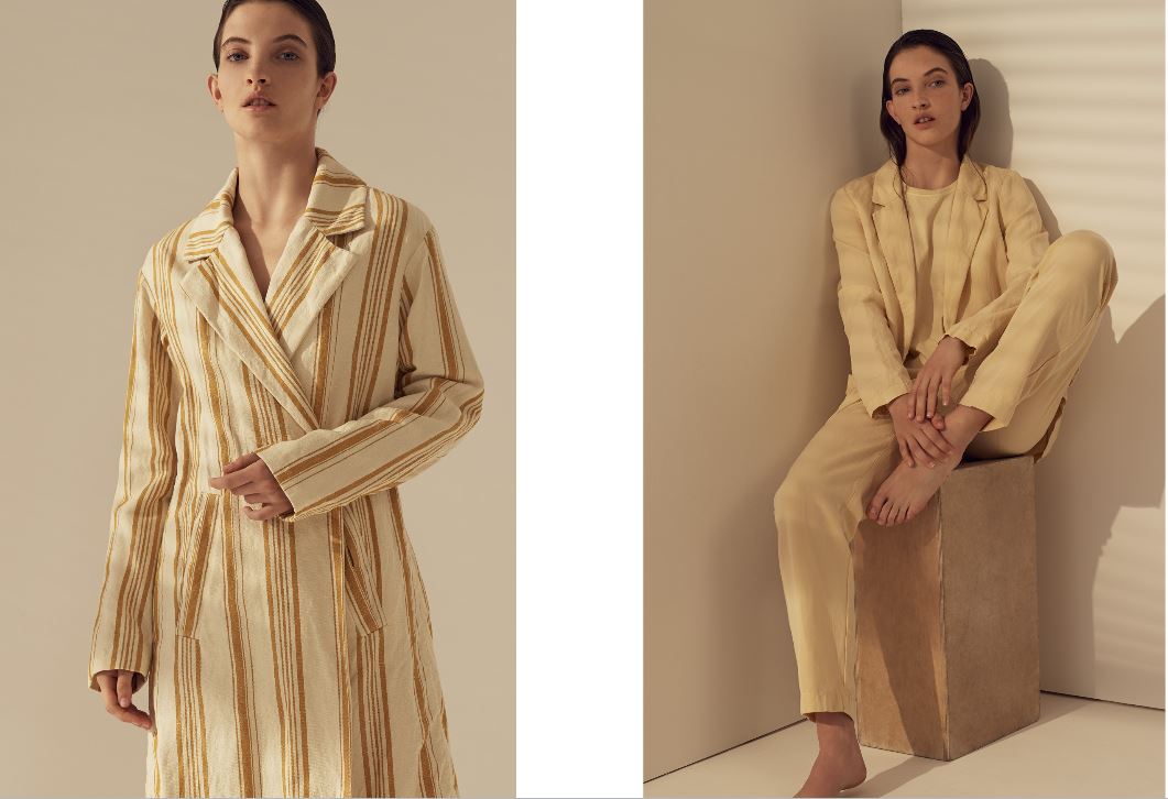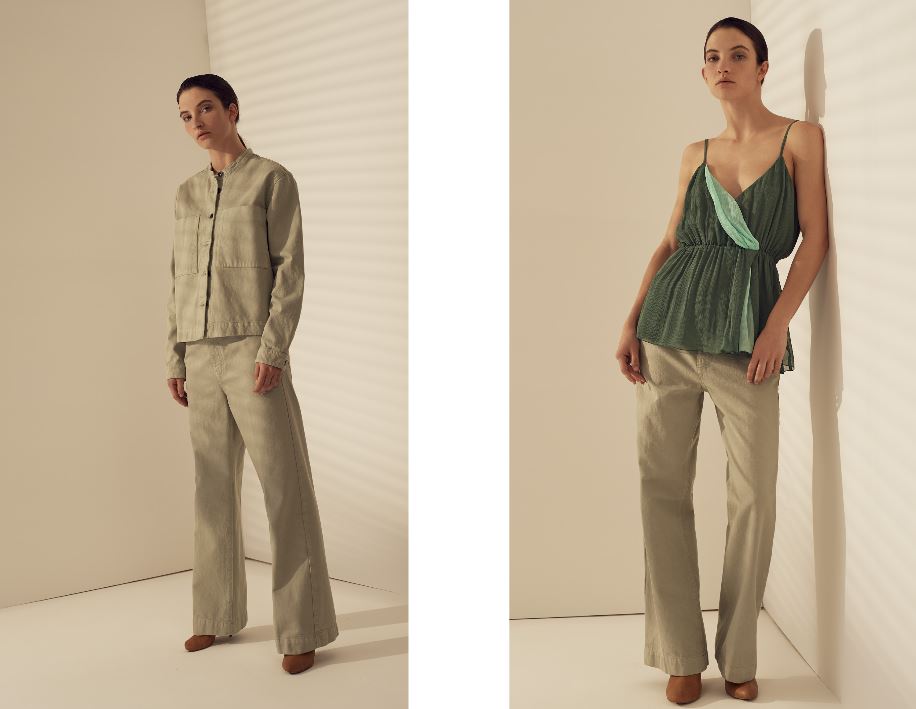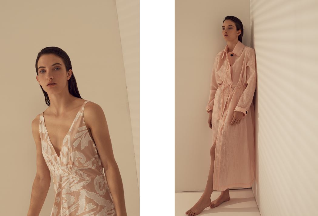 I tessuti usati sono il lino croccante trattato al sale, le sete con riga sfumata che spezza abiti e t-shirt con colori delicatie tonalie la singolare riga materasso sul twill per i trench dal volume over. Stampe del “giardino fiorito” su popeline leggero lavato, stampe“essenze” d’ispirazione vintage su goffrato leggero, garza rigata frangiata, organze trasparenti e leggerezze sussurrate dalle trame ci riportano a una nuova femminilità. I materiali composti da fibre naturali accarezzano ed evidenziano il corpo con delicatezza e armonia. La leggerezza e l’esclusività dei materiali rendono possibili forme e volumi ben definiti.
