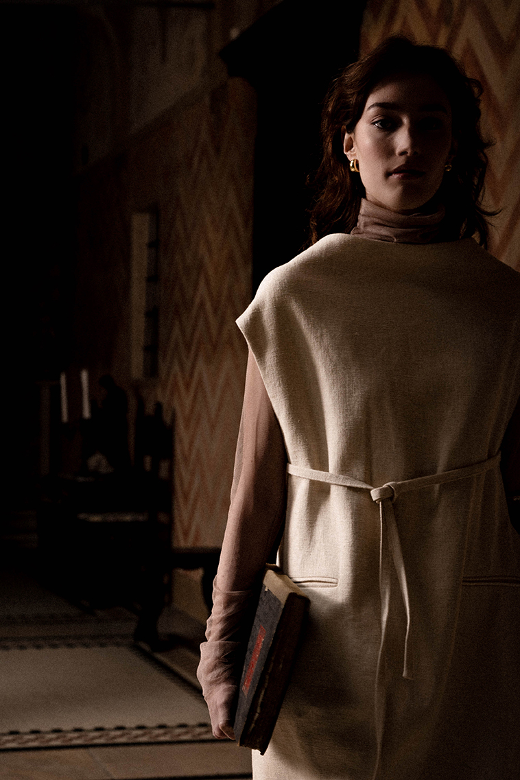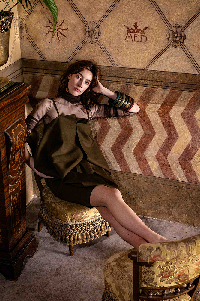 Foto di apertura servizio “Quando la donna cambia pelle”: outfit Cassell; cappello Patrizia Fabri Hats