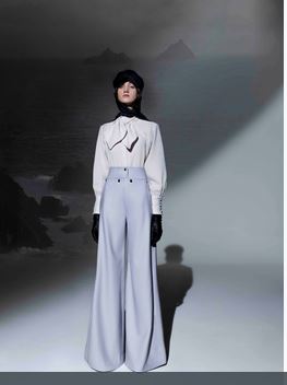Alla morbidezza dei tessuti fluidi è affidato il racconto sentimentale dell’attesa: triple georgette lavate, lo chiffon di piccole ortensie a decorazione, la tundra che con la texture da garza scolpisce l’allure retrò di colli a nido d’ape e rouche, plasmano la delicatezza sartoriale dei capi femminili che sul retro custodiscono lo stupore della trasformazione grazie a coulisse, elementi elastici e nastri in gros grain che sciolgono l’abito da sera in ampie vesti impalpabili. Accade in “Nodo di Polvere” che culla il sonno di lei, accarezzata dal ricordo di lui che si è annodata al collo nel grande fiocco, dove ha raccolto le emozioni che tratteneva nell’austerità de “La Maestra”, chiuse nella nettezza del taglio in sbieco e nella ricchezza della manica ottocentesca, insieme al candore de “La Solitudine” che sublima nel bianco puro del collo costruito a suggestione di quello di una monaca che abita la chiesetta sulla costiera, la stessa a cui la donna affida
