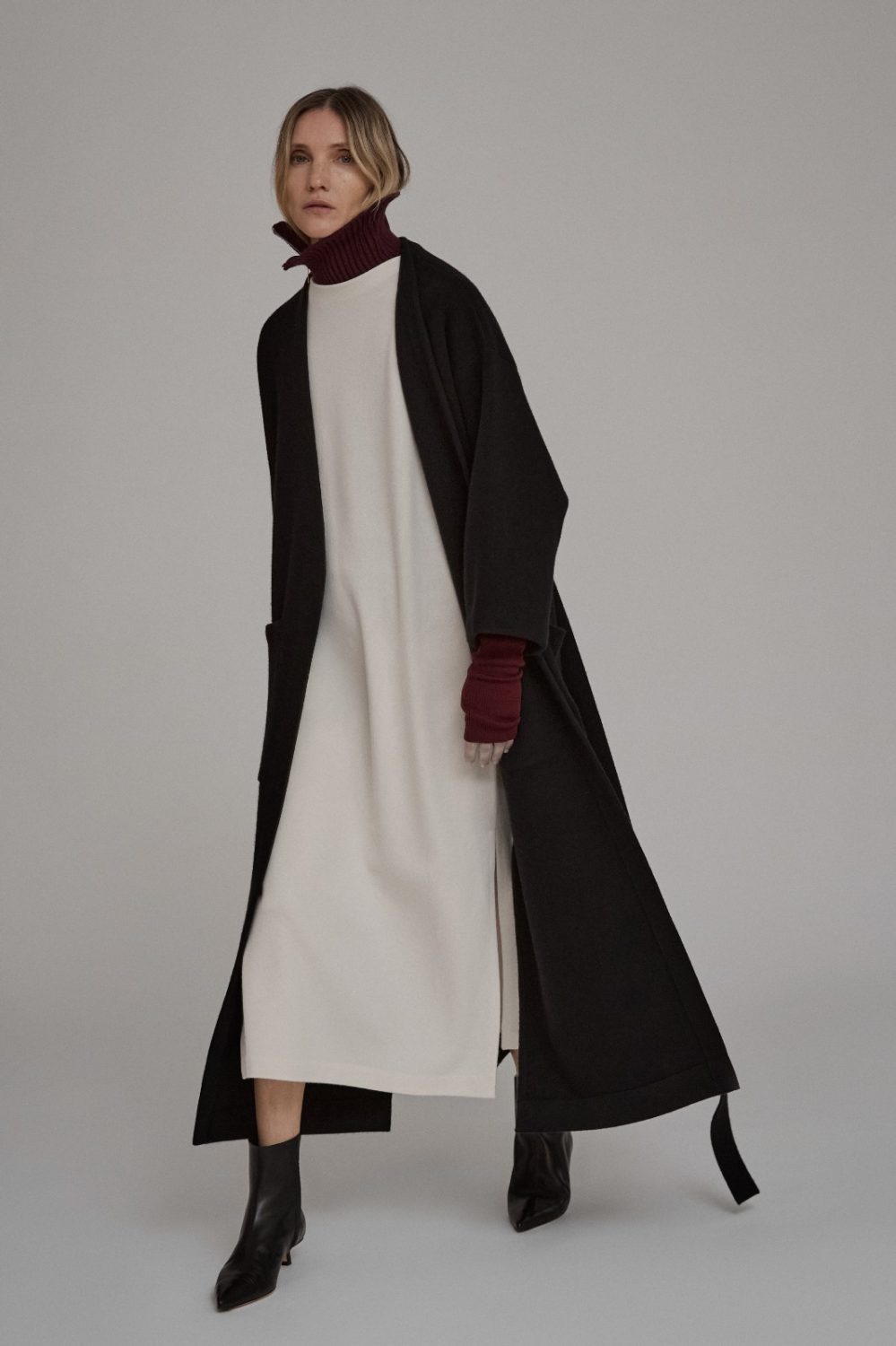 La selezione di tessuti include lana vergine di Loro Piana ed Ermenegildo Zegna, grisaglia e flanelle abbinate a sete di Ratti, come duchesse strutturate e satin fluidi. La maglieria in cashmere di Cariaggi aggiunge morbidezza e comfort. Le lavorazioni sartoriali e le sovrapposizioni conferiscono profondità e dinamismo ai capi.
