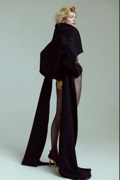 Balestra si reinterpreta irriverente e dark attraverso l’uso di nuance profonde, toni gioiello, pizzo e ricamo foliage che disegnano sinuosamente la figura. Il jersey laminato e le maglie in lurex evocano l’immagine di un corpo scolpito nel metallo: drappeggi e arricciature avvolgono la silhouette come una corazza protettiva.