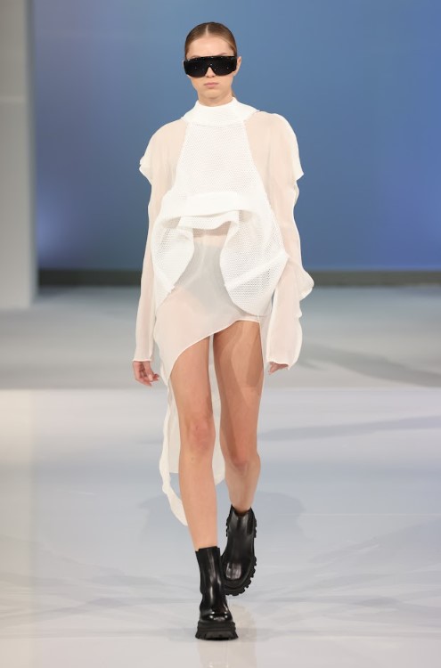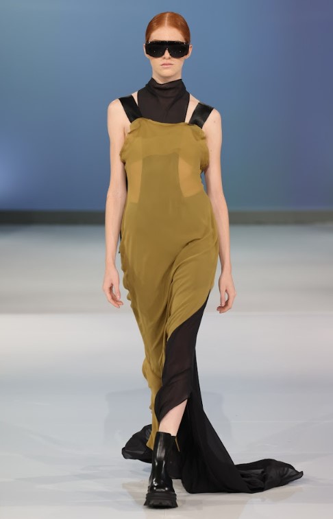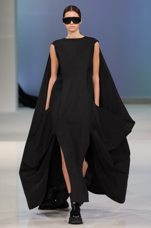 Abiti che combinano leggerezza e struttura, creano un universo in cui la forza femminile manifesta un mondo contemporaneo. Modelli strutturati, tagli precisi abbinati a una scelta di tessuti classici e non, sviluppati in una palette cromatica che enfatizza questo dualismo fra la natura e la tecnologia – colori che spaziano dal verde foresta all’oliva, pietra, carbone e nero.